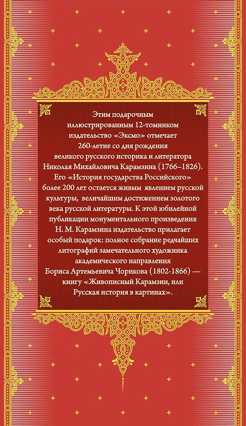 💳 Оплатить за товар можно при получении 🇰🇿 Есть бесплатная доставка по Казахстану от 1 дня 🎁 Копите бонусы с каждой покупки Серия: Эксклюзивная коллекция. Подарочное собрание сочинений в коробе Этим подарочным иллюстрированным 12-томником в пяти книгах издательство «Эксмо» отмечает 260-летие со дня рождения великого русского историка и литератора Николая Михайловича Карамзина (1766–1826). Его «История государства Российского» более 200 лет остается живым явлением русской культуры, величайшим достижением золотого века русской литературы. |