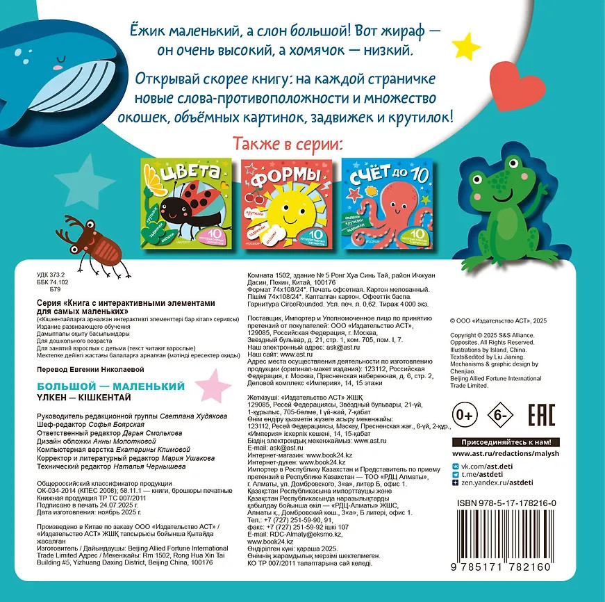 💳 Оплатить за товар можно при получении 🇰🇿 Есть бесплатная доставка по Казахстану от 1 дня 🎁 Копите бонусы с каждой покупки Серия: Книга с интерактивными элементами для самых маленьких Ёжик маленький, а слон большой! Вот жираф — он очень высокий, а хомячок — низкий. Открывай скорее книгу: на каждой страничке новые слова-противоположности и множество окошек, объёмных картинок, задвижек и крутилок! |