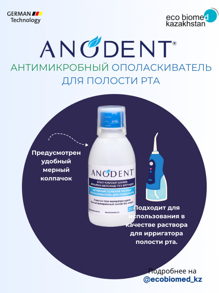 | Бренд солевого ополаскивателя для полости рта. Производится в Казахстане. Ополаскиватель предназначен для гигиены полости рта, обеспечивает антибактериальное действие, предупреждает осложнения после хирургических вмешательств. Снижает индексы зубного налёта и гингивита. Особенно рекомендован при наличии ортодонтических конструкций (брекет-систем и прочее), несъёмных и частично съёмных зубных протезов. Устраняет неприятные запахи. Эффективно очищает полость рта от мультирезистентных... |
