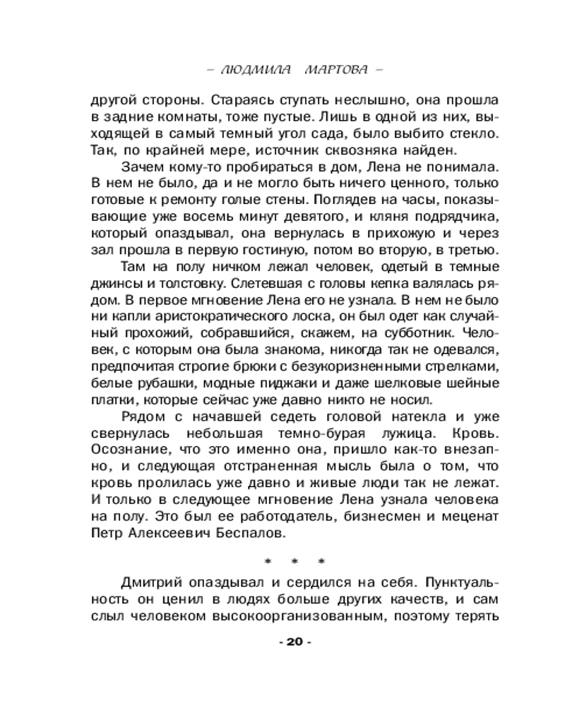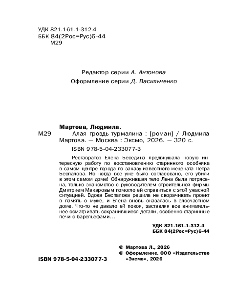 💳 Оплатить за товар можно при получении 🇰🇿 Есть бесплатная доставка по Казахстану от 1 дня 🎁 Копите бонусы с каждой покупки Серия: Преступные камни. Лучшие детективы о драгоценностях. Новое оформление (обложка) Реставратор Елена Беседина предвкушала новую интересную работу по восстановлению старинного особняка в самом центре города по заказу известного мецената Петра Беспалова. Но когда всё уже было согласовано, его убили в этом самом доме! Обнаружившая тело Лена была потрясена, только знакомство с руководителем строительной фирмы Дмитрием Макаровым помогло ей справиться с этой ужасной ситуацией. Вдова Беспалова решила не сворачивать проект в память о муже, и Елена вновь оказалась в злосчастном доме. Что-то не давало ей покоя, заставляя всё внимательнее осматривать сохранившиеся детали, особенно старинные печи с барельефами... |