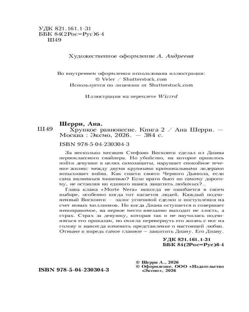💳 Оплатить за товар можно при получении 🇰🇿 Есть бесплатная доставка по Казахстану от 1 дня 🎁 Копите бонусы с каждой покупки Серия: Хрупкое равновесие. Бестселлеры Аны Шерри За несколько месяцев Стефано Висконти сделал из Дианы первоклассного снайпера. Но убийство, на которое пришлось пойти девушке в целях самозащиты, нарушает спокойное течение жизни: между двумя крупными криминальными лидерами вспыхивает война. Как спасти своего Черного Дьявола, если сама являешься мишенью? Если враги бьют по самому дорогому, не оставляя ни единого шанса защитить любимых?.. |