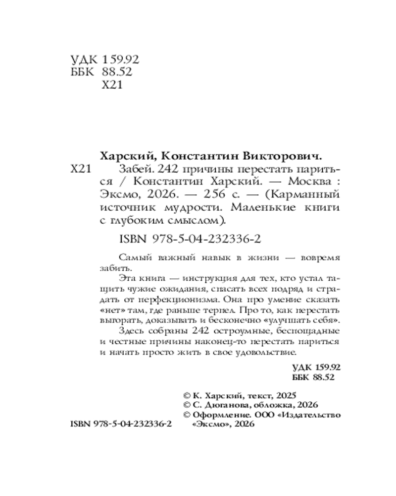 💳 Оплатить за товар можно при получении 🇰🇿 Есть бесплатная доставка по Казахстану от 1 дня 🎁 Копите бонусы с каждой покупки Серия: Карманный источник мудрости. Маленькие книги с глубоким смыслом Самый важный навык в жизни — вовремя забить. Эта книга — инструкция для тех, кто устал тащить чужие ожидания, спасать всех подряд и страдать от перфекционизма. Она про умение сказать «нет» там, где раньше терпел. Про то, как перестать выгорать, доказывать и бесконечно «улучшать себя». Здесь собраны 242 остроумные, беспощадные и честные причины наконец-то перестать париться и начать просто жить в свое удовольствие. |