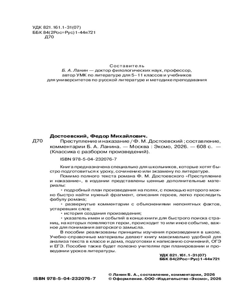 💳 Оплатить за товар можно при получении 🇰🇿 Есть бесплатная доставка по Казахстану от 1 дня 🎁 Копите бонусы с каждой покупки Серия: Классика с разбором произведений Книга предназначена специально для школьников, которые хотят быстро подготовиться к уроку, сочинению или экзамену по литературе. Помимо полного текста романа Ф. М. Достоевского «Преступление и наказание», в издании представлены ценные дополнительные материалы: |