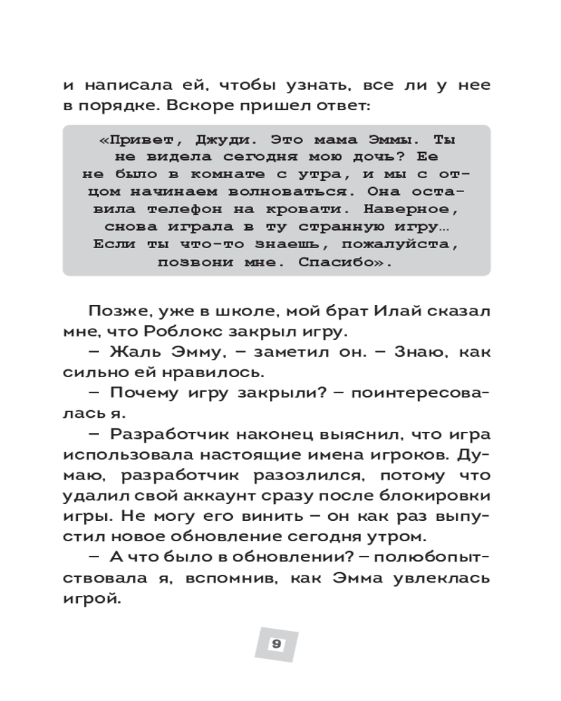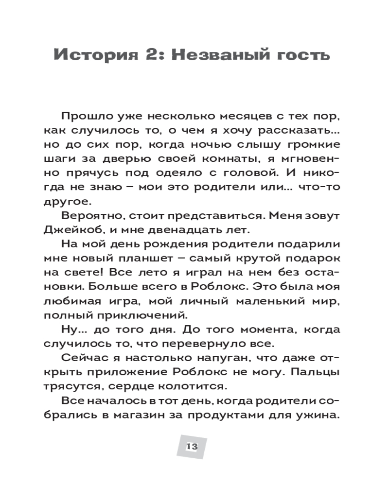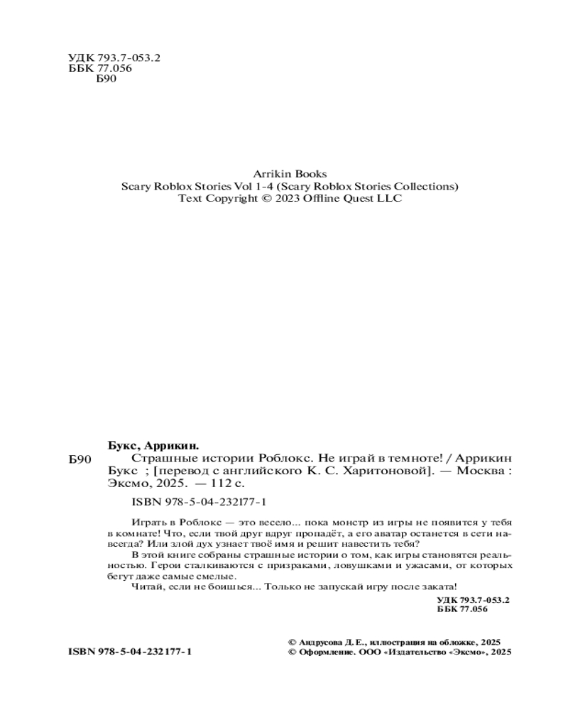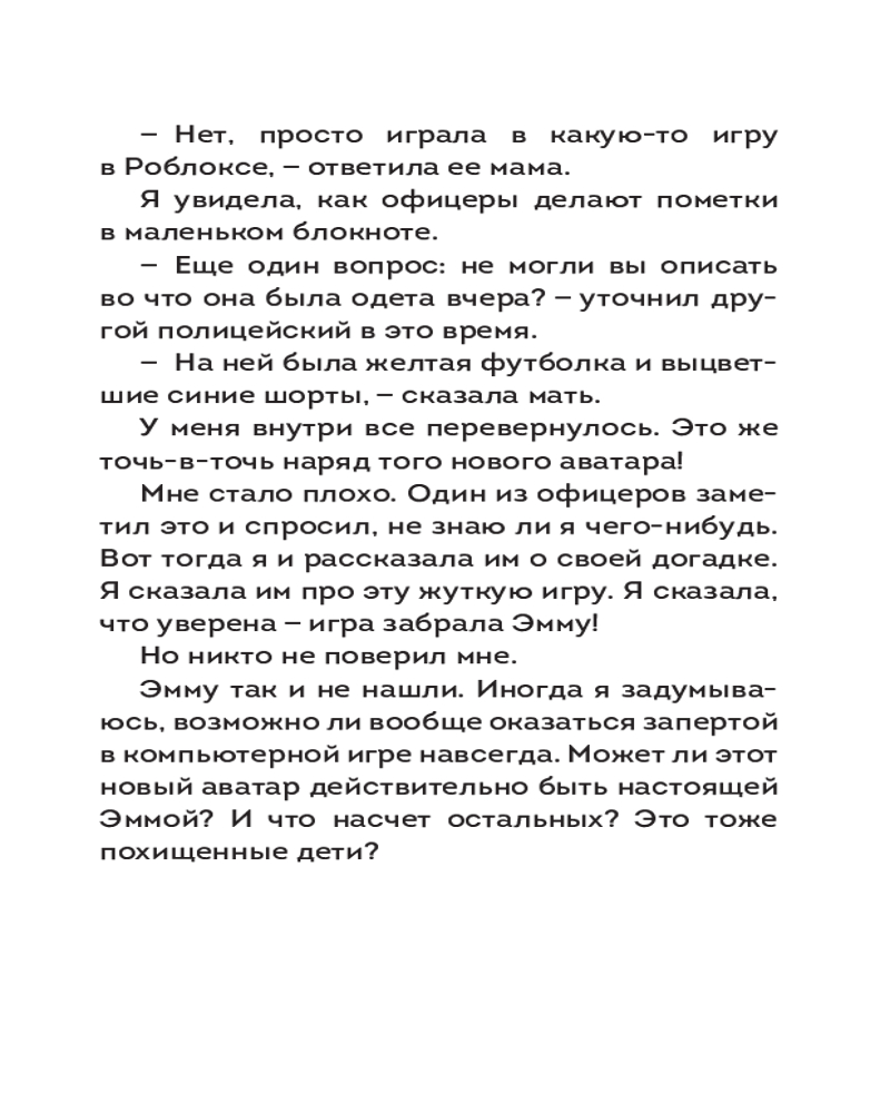 💳 Оплатить за товар можно при получении 🇰🇿 Есть бесплатная доставка по Казахстану от 1 дня 🎁 Копите бонусы с каждой покупки Серия: Роблокс. Опасные игры Осторожно: игра может стать реальностью! Казалось бы, обычные игры в «Роблокс» — весёлое развлечение для детей. Но что, если однажды монстр с экрана появится в твоей комнате? Если твой друг вдруг исчезнет, а его аватар останется в игре навсегда? Если злой дух узнает твоё настоящее имя и придёт в гости? В этом сборнике тебя ждут леденящие душу истории о самом страшном: граница между виртуальным миром и реальностью стирается. Дети попадают в ловушки, слышат шаги за дверью, сталкиваются с призраками и понимают, что их самые большие страхи теперь живут не только на мониторе. Не играйте в одиночку. Не доверяйте незнакомцам в Сети. И никогда, никогда не запускайте эти игры после заката... |