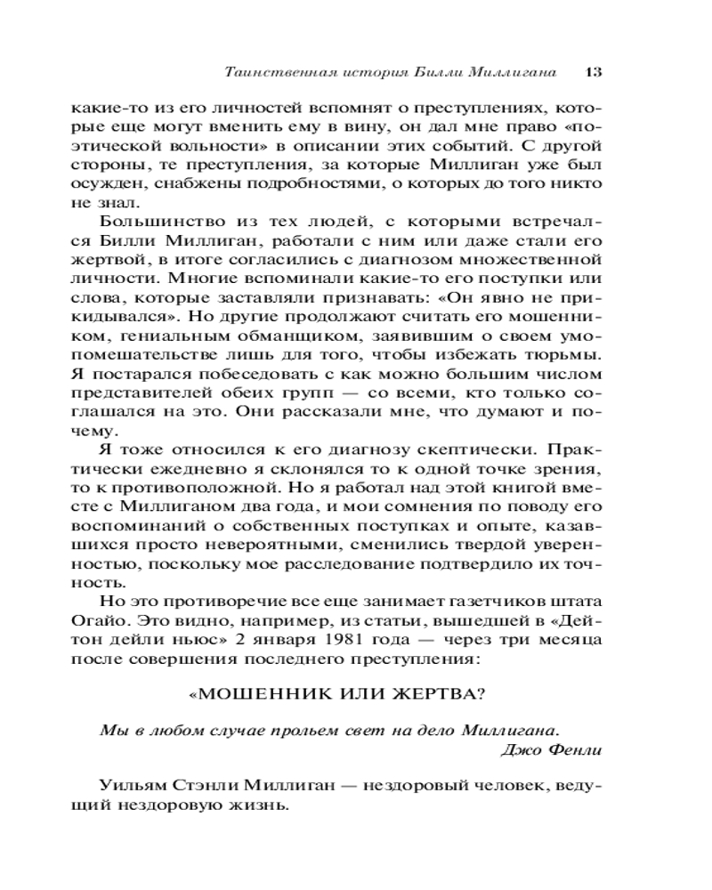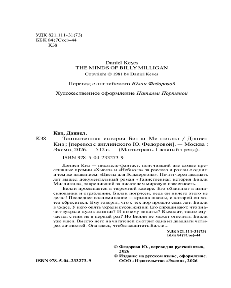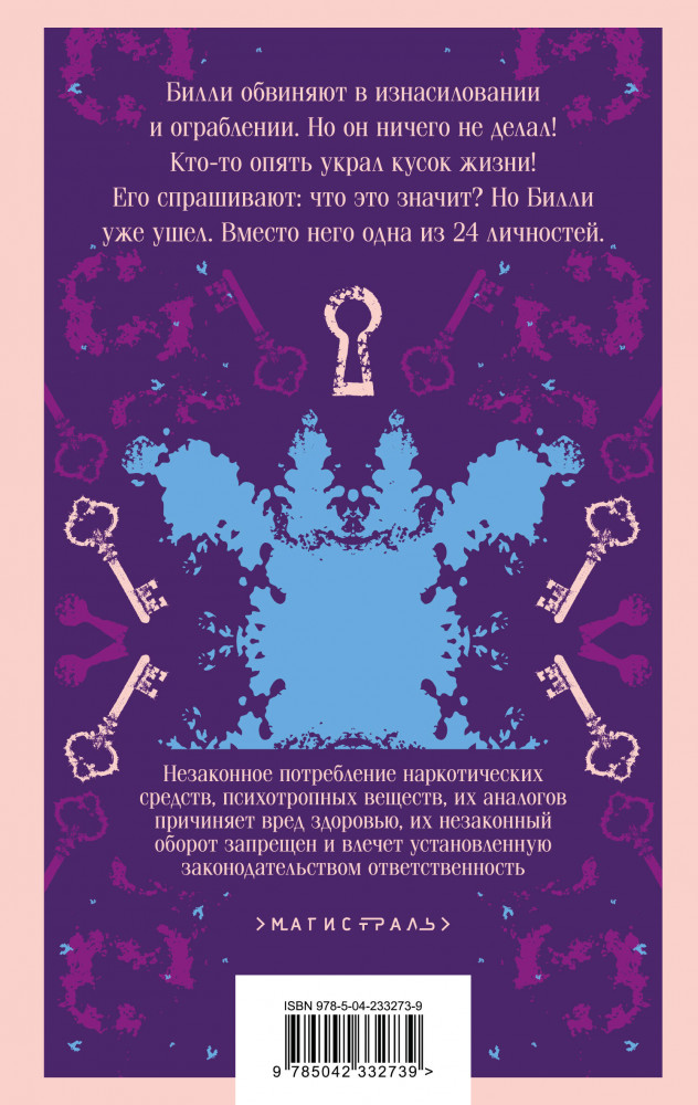 💳 Оплатить за товар можно при получении 🇰🇿 Есть бесплатная доставка по Казахстану от 1 дня 🎁 Копите бонусы с каждой покупки Серия: Магистраль. Главный тренд Билли просыпается в тюремной камере. Его обвиняют в изнасиловании и ограблении. Билли потрясен, ведь он ничего этого не делал! Последнее воспоминание — крыша школы, с которой он хотел сброситься. Ему говорят, что с тех пор прошло семь лет. Билли в ужасе. У него опять украли кусок жизни! Его спрашивают: что значит «украли кусок жизни»? И почему «опять»? Выходит, такое случается с ним не в первый раз? Но Билли не может ответить. Билли уже ушел. Вместо него на читателей смотрит одна из двадцати четырех личностей. Она здесь, чтобы защитить Билли... |