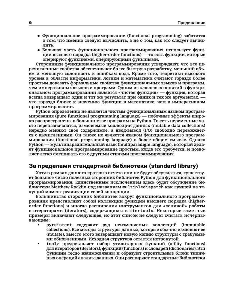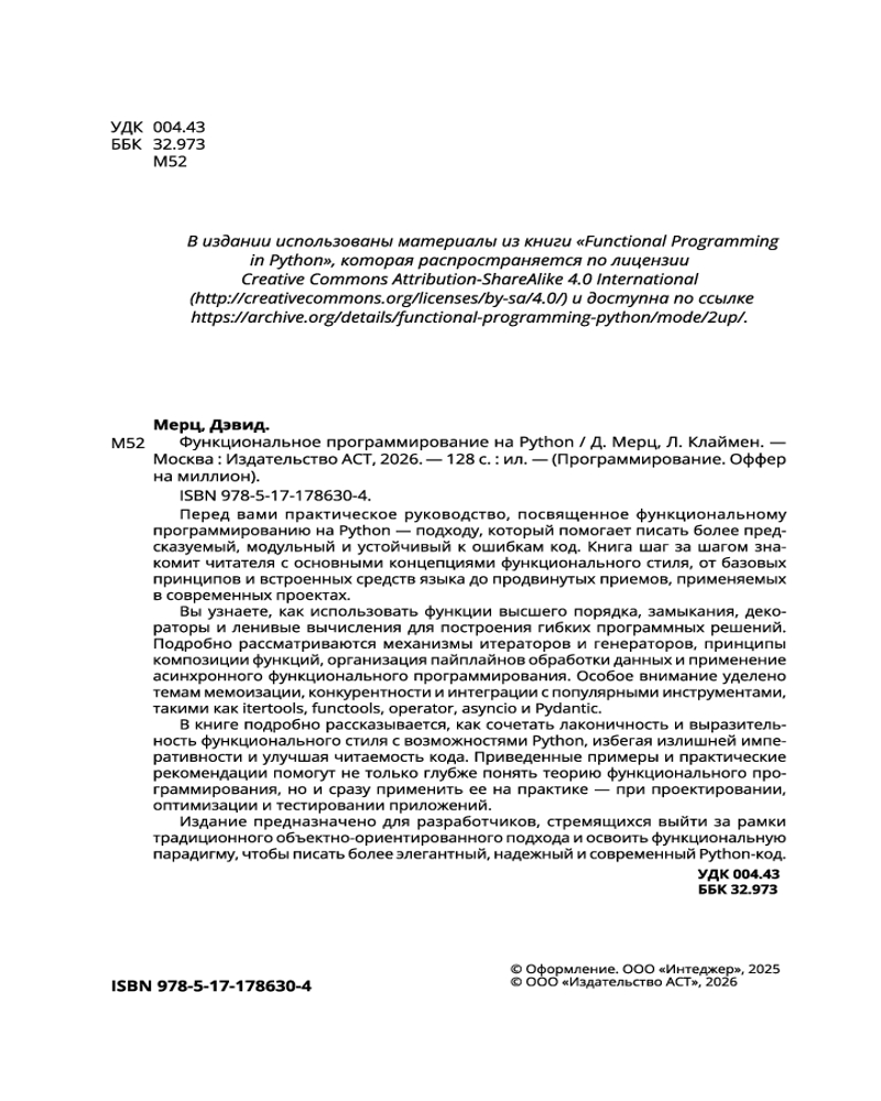 Издание предназначено для разработчиков, стремящихся выйти за рамки традиционного объектно-ориентированного подхода и освоить функциональную парадигму, чтобы писать более элегантный, надежный и современный Python-код. |