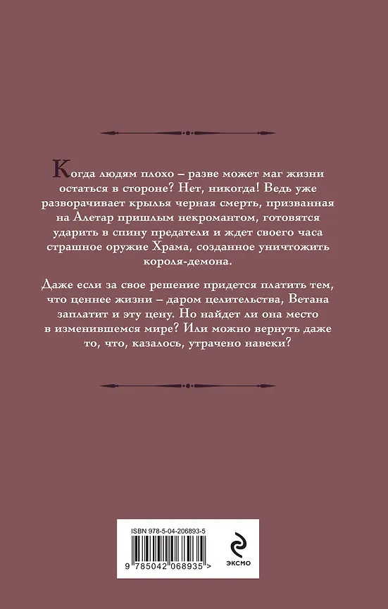 Когда людям плохо — разве может маг жизни остаться в стороне? Нет, никогда! Ведь уже разворачивает крылья черная смерть, призванная на Алетар пришлым некромантом, готовятся ударить в спину предатели и ждет своего часа страшное оружие Храма, созданное уничтожить короля-демона. Даже если за свое решение придется платить тем, что ценнее жизни — даром целительства, Ветана заплатит и эту цену. Но найдет ли она место в изменившемся мире? Или можно вернуть даже то, что, казалось, утрачено навеки?