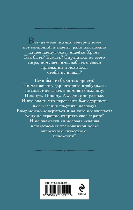 Ветана — маг жизни, теперь в этом нет сомнений, а значит, рано или поздно на нее начнут охоту ищейки Храма. Как быть? Бежать? Спрятаться от всего мира, поменять имя, забыть о своем призвании и молиться, чтобы не нашли? Если бы это было так просто! Но маг жизни, дар которого пробудился, не может отказать в помощи больному. Никогда. Никому. А люди они разные. И кто знает, что перевесит: благодарность или желание получить награду? Кому можно довериться и на кого положиться? Кому не страшно открыть свое сердце? И не окажется ли молодая лекарка в подземельях храмовников после очередного «чудесного» исцеления?