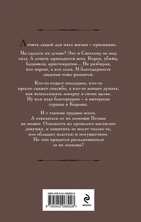 Лечить людей для мага жизни — призвание. Но сделать их лучше? Это и Светлому не под силу. А лечить приходится всех. Воров, убийц, бедняков, аристократов... Не разбирая, кто хорош, а кто плох. И благодарность людская тоже разнится. Кто-то отдаст последнее, кто-то просто скажет спасибо, а кто-то начнет думать, как использовать лекарку в своих целях. Ну или куда благороднее — в интересах страны и Короны. И с такими труднее всего. А отказаться от их помощи Ветана не может. Опасность из прошлого настигает девушку, и защитить ее могут только те, кто обладает властью и могуществом. Но чем придется расплачиваться за их помощь? |