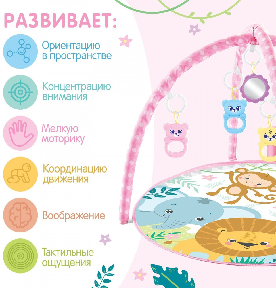 Подвижные красочные погремушки и звуки, которые они издают, привлекают внимание малыша. Он с радостью наблюдает за фигурками, пытается дотянуться. Таким образом развивает зрение, внимание, способность концентрироваться на предмете. Нажимая на яркие клавиши, малыш будет слушать красивые мелодии и детские песенки, а также развивать музыкальный слух, чувство ритма, мелкую моторику и умение распознавать звуки.