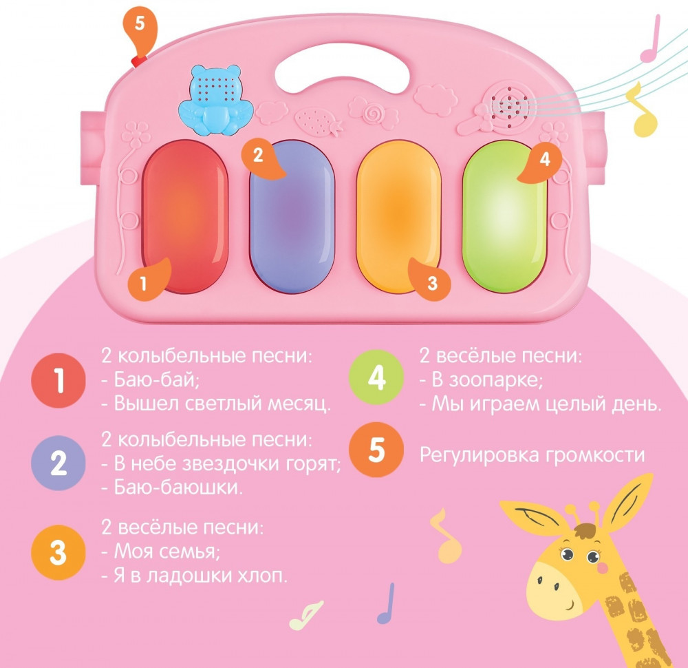 • игрушка воспроизводит 4 колыбельные песни и 4 весёлые песни