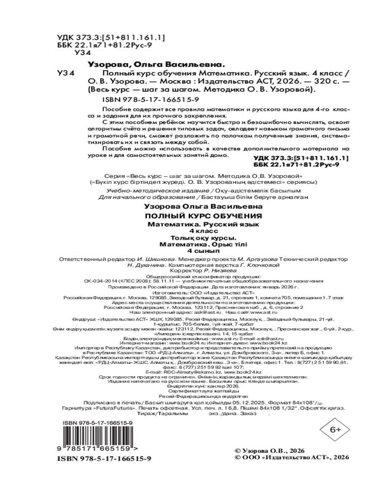 💳 Оплатить за товар можно при получении 🇰🇿 Есть бесплатная доставка по Казахстану от 1 дня 🎁 Копите бонусы с каждой покупки Серия: Весь курс - шаг за шагом. Методика О. В. Узоровой Пособие содержит все правила математики и русского языка для 4 класса и задания для их прочного закрепления. С этим пособием ребёнок научится быстро и безошибочно вычислять, освоит алгоритмы счёта и решения типовых задач, овладеет навыком грамотного письма и грамотной речи, сможет разложить по полочкам полученные знания, систематизировать их и связать между собой. Пособие можно использовать в качестве дополнительного материала на уроке и для самостоятельных занятий дома. |
