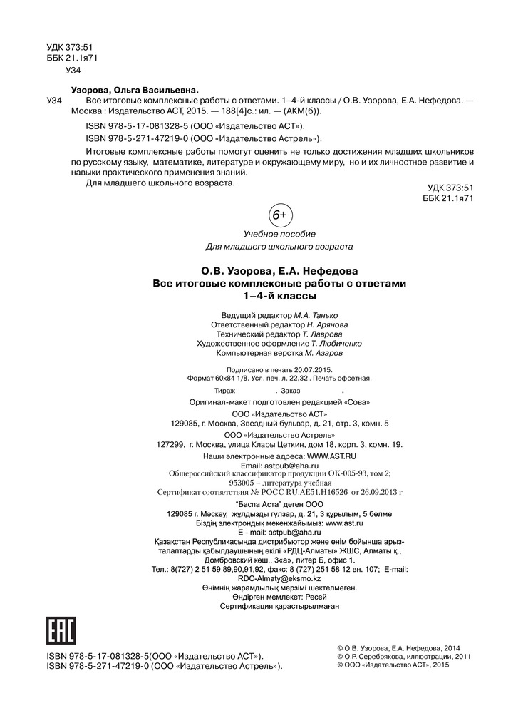 Все итоговые комплексные работы с ответами. 1-4 классы. ФГОСОльга Васильевна Узорова, Елена Алексеевна Нефедова В данный момент этот товар отсутствует в продаже. Возможно, у нас найдется аналогичный или похожий товар здесь. Серия: АКМ(б) Итоговые комплексные работы помогут оценить не только достижения младших школьников по русскому языку, математике, литературе и окружающему миру, но и их личностное развитие и навыки практического применения знаний. |