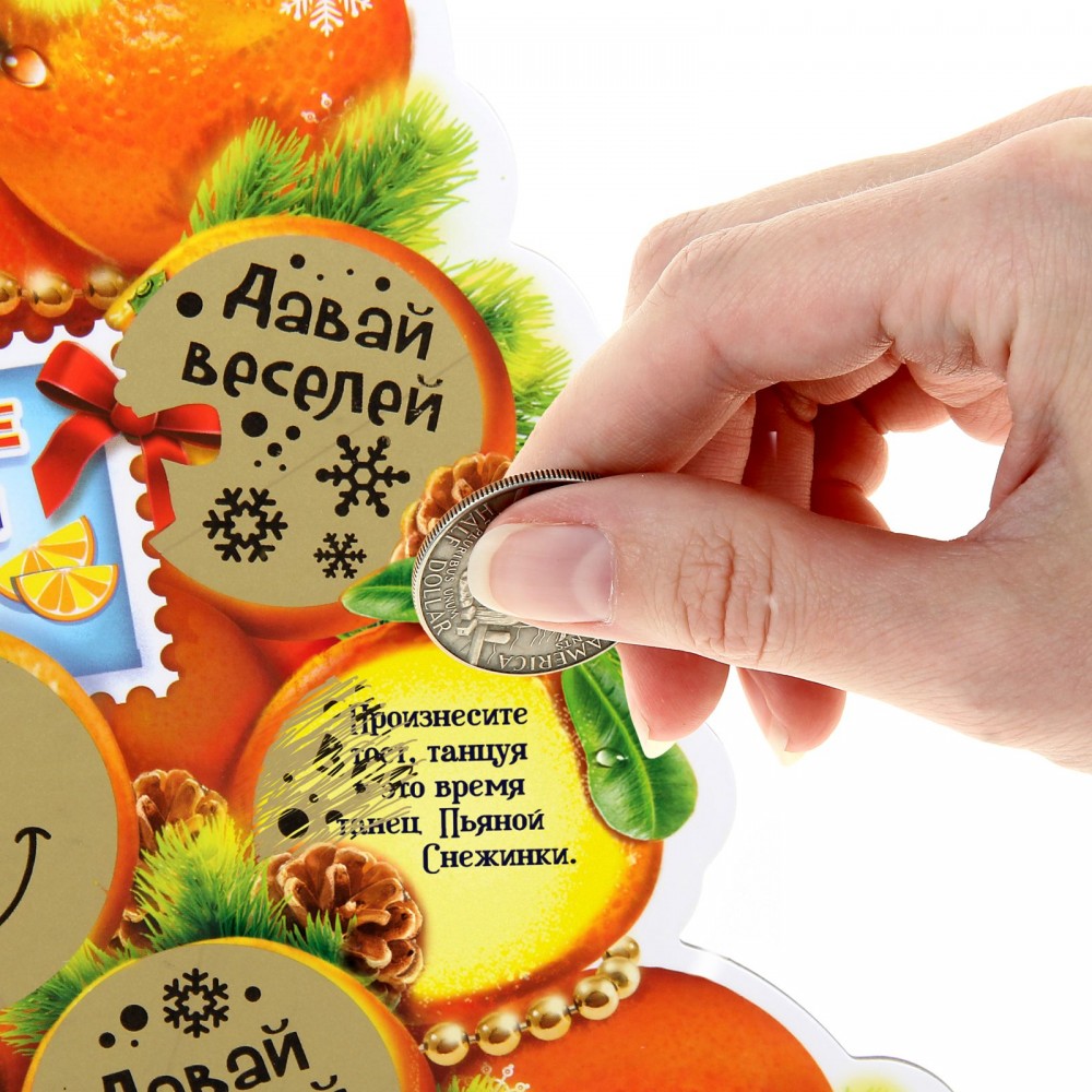 Однако любой подарок будет выглядеть неполным без оригинальной поздравительной карточки. Удивить родных и коллег поможет ёлка со скретч-слоем «Веселые тосты» в авторском дизайне. На деревце «развешаны», словно игрушки, маленькие пожелания под скретч-слоем, который нужно стереть, когда часы пробьют двенадцать.