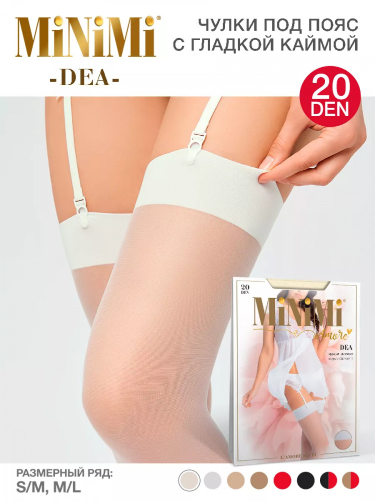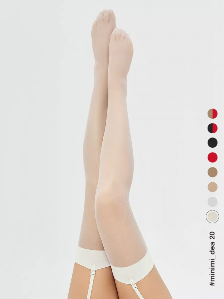 Чулки женские под пояс MiNiMi DEA 20 den — тонкие, эластичные чулки с гладкой широкой каймой для крепления застежек пояса. Обращаем Ваше внимание, что пояс для чулок в комплекте не идет!