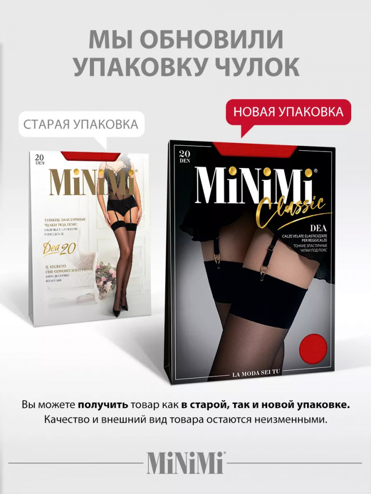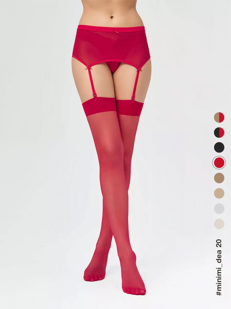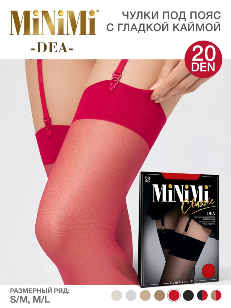 Чулки женские под пояс MiNiMi DEA 20 den — тонкие, эластичные чулки с гладкой широкой каймой для крепления застежек пояса. Обращаем Ваше внимание, что пояс для чулок в комплекте не идет!