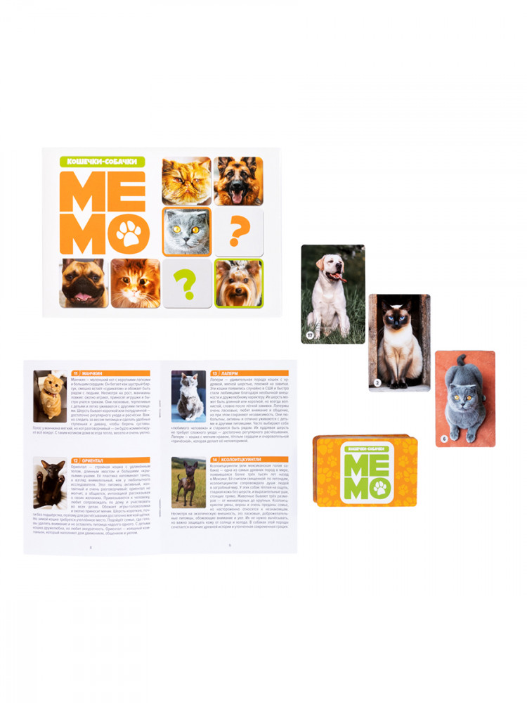 Игра Мемо «Кошечки-собачки» - это увлекательная игра, благодаря которой вы познакомитесь с разными породами кошек и собак, узнаете, чем отличается сфинкс от мейн-куна, почему далматинцы в детстве без пятен, какие собаки считаются самыми умными, а какие кошки - самыми разговорчивыми. Вас ждет множество любопытных фактов о ваших любимых пушистых друзьях. А чтобы новые знания запоминались легче и интереснее, каждое описание дополнено яркими иллюстрациями и занимательными фактами.