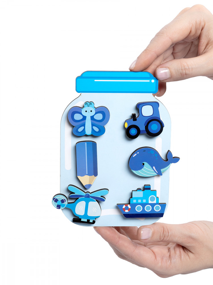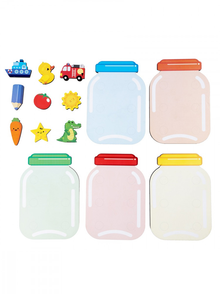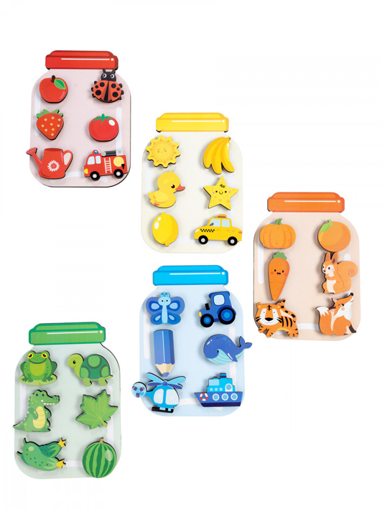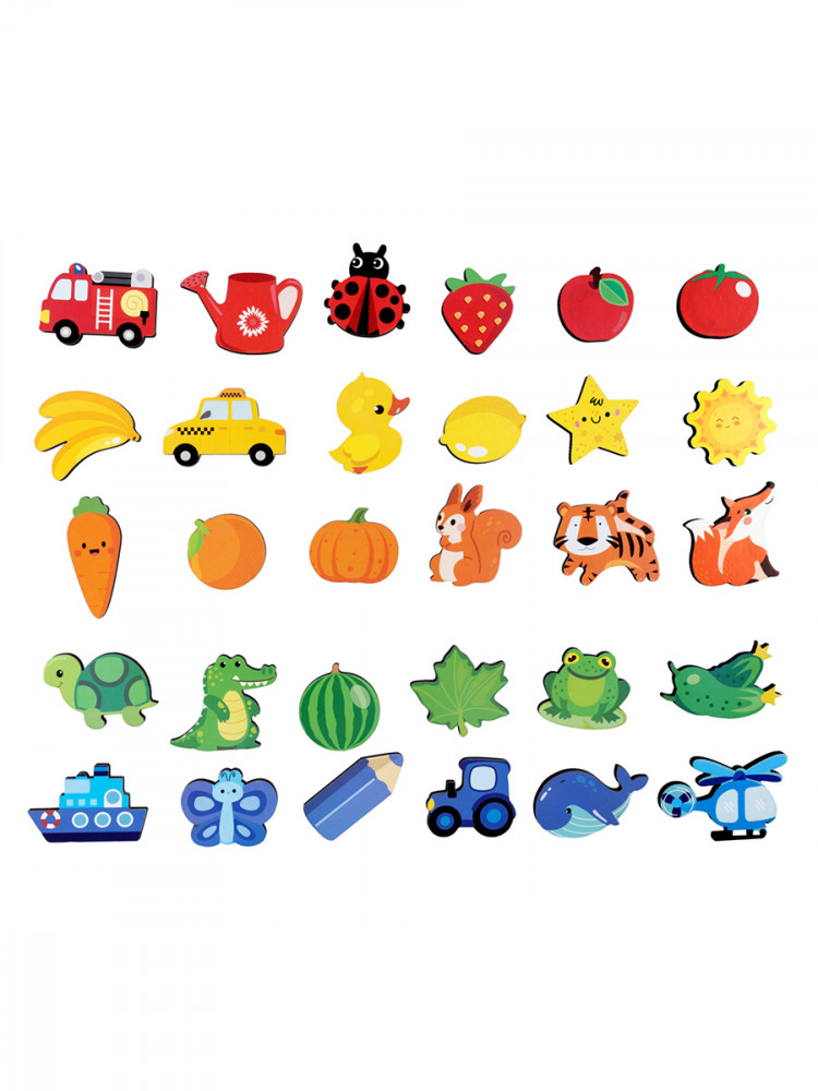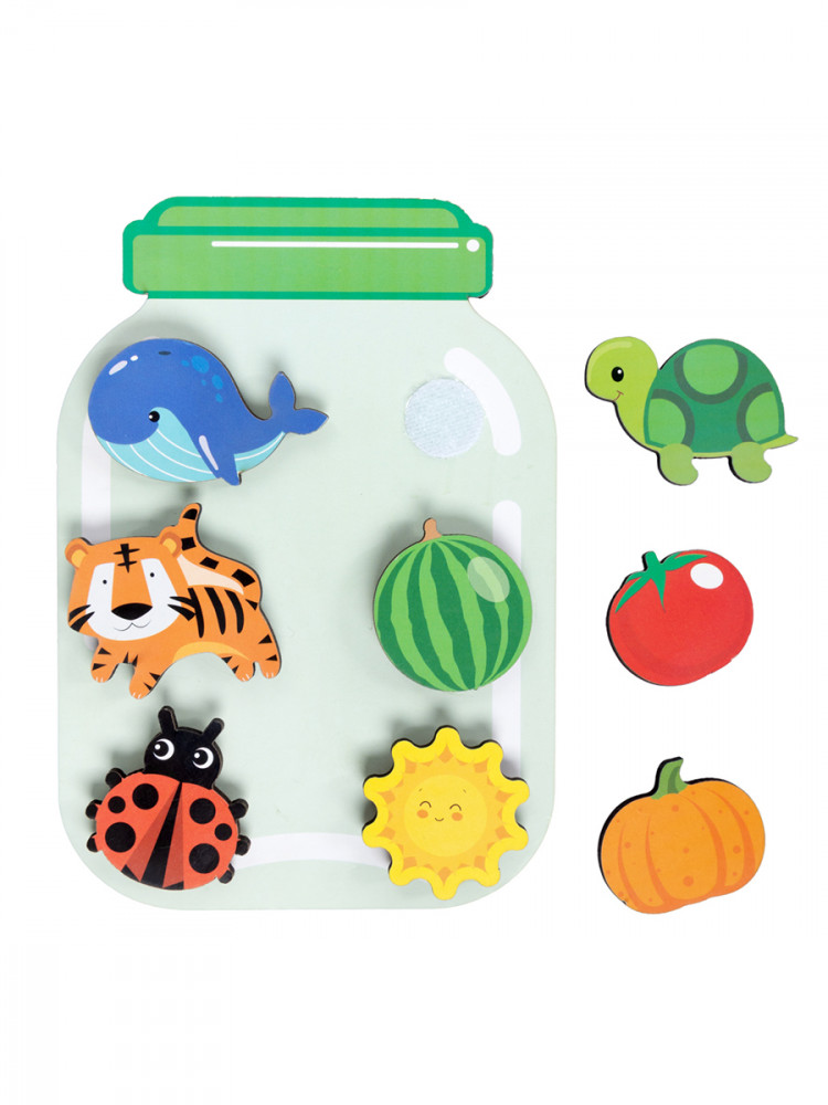 В наборе представлены 30 деревянных элементов таких как: овощи, фрукты, животные, транспорт и другие, соответствующие каждому цвету банки. Дети смогут не только учиться различать цвета, но и тренировать свои навыки сортировки и координации. Элементы легко приклеиваются к банкам благодаря комплекту липучек, что позволяет свободно экспериментировать с размещением.