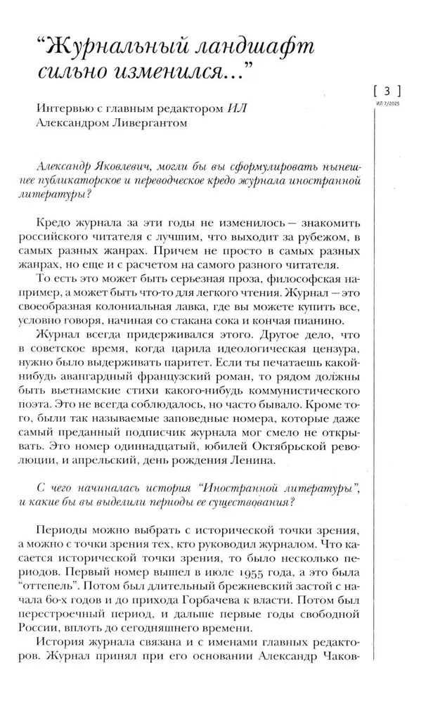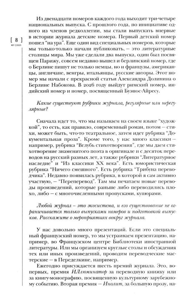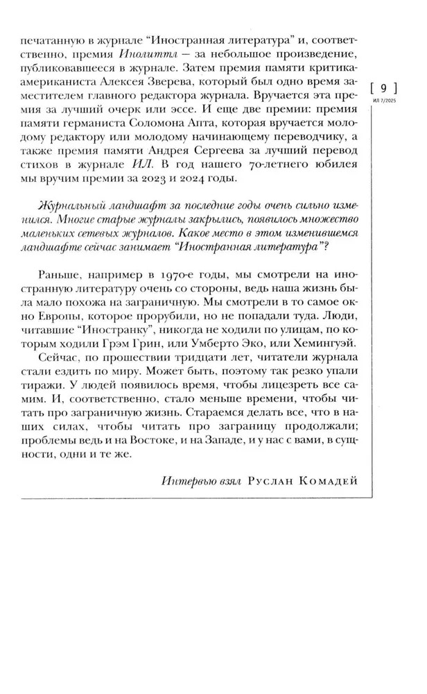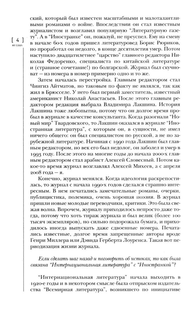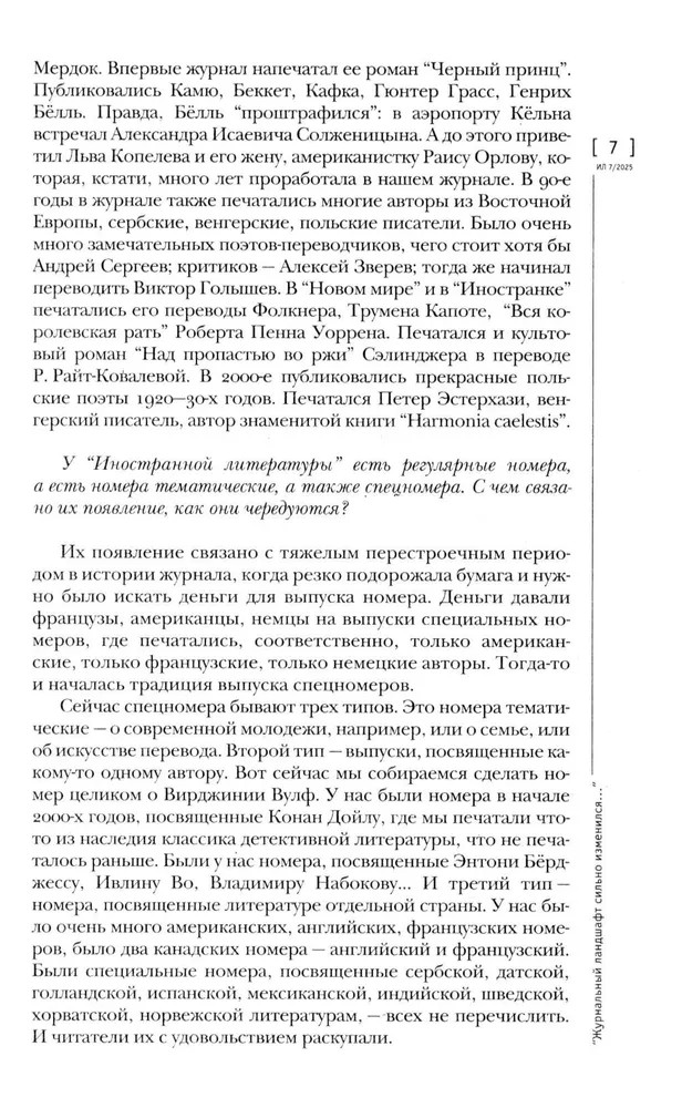 Журнал «Иностранная литература» № 7. 2025 гВ данный момент этот товар отсутствует в продаже. Возможно, у нас найдется аналогичный или похожий товар здесь. «Иностранная литература» («ИЛ») — ежемесячный советский (1955–1991) и российский (с 1991) литературно-художественный журнал. Специализируется на публикации переводной литературы. Основан в июле 1955 года как орган правления Союза писателей СССР. В журнале публикуются наиболее значительные произведения современной мировой литературы в переводах лучших отечественных переводчиков. |