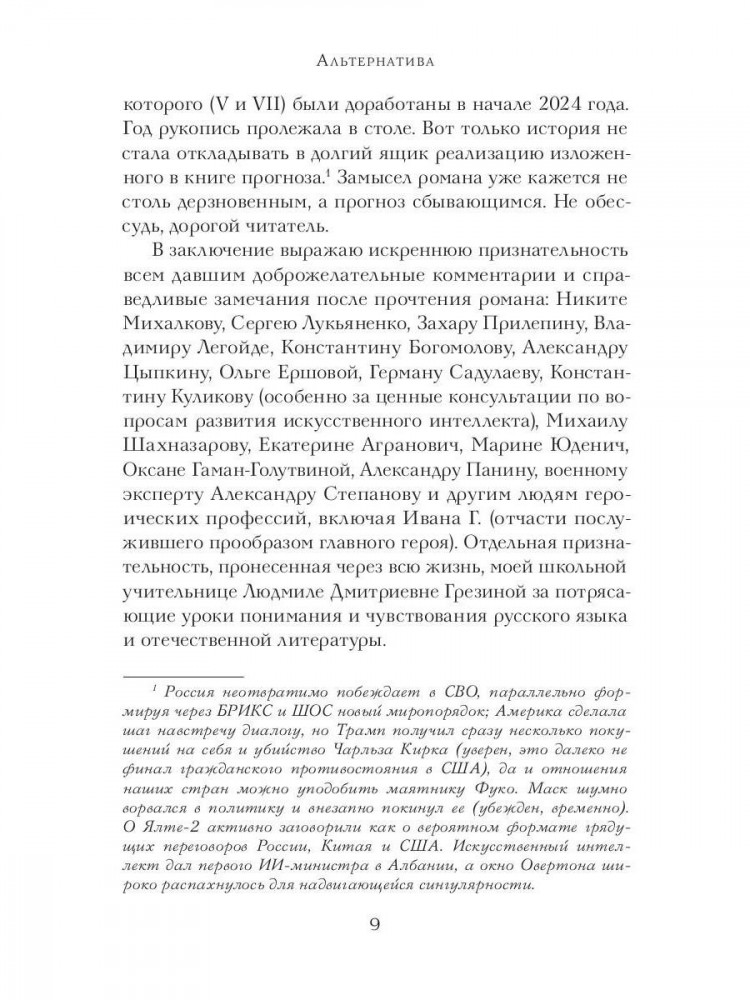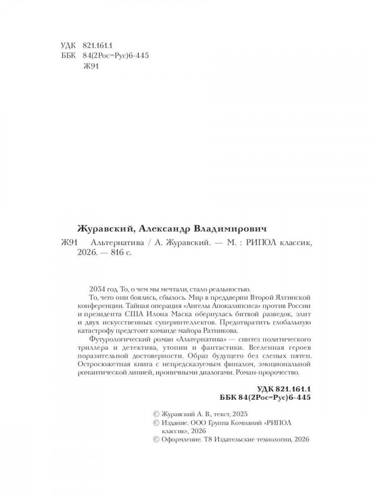 💳 Оплатить за товар можно при получении 🇰🇿 Есть бесплатная доставка по Казахстану от 1 дня 🎁 Копите бонусы с каждой покупки 2034 год. То, о чем мы мечтали, стало реальностью. То, чего они боялись, сбылось. Мир в преддверии второй Ялтинской конференции. Тайная операция «Ангелы Апокалипсиса» против России и президента США Илона Маска обернулась битвой разведок, элит и двух искусственных суперинтеллектов. Предотвратить глобальную катастрофу предстоит команде майора Ратникова. Футурологический роман «Альтернатива» — синтез политического триллера и детектива, утопии и фантастики. Вселенная героев поразительной достоверности. Образ будущего без слепых пятен. Остросюжетная книга с непредсказуемым финалом, эмоциональной романтической линией, ироничными диалогами. Роман-пророчество. |