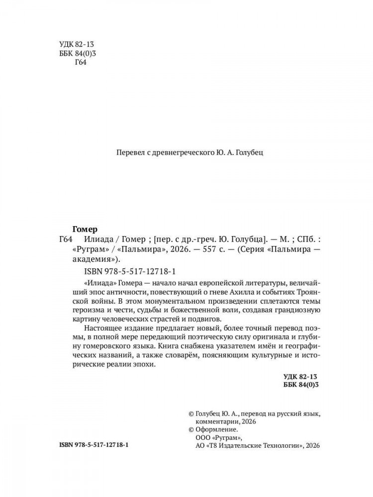 💳 Оплатить за товар можно при получении 🇰🇿 Есть бесплатная доставка по Казахстану от 1 дня 🎁 Копите бонусы с каждой покупки Серия: Пальмира — академия «Илиада» Гомера — начало начал европейской литературы, величайший эпос античности, повествующий о гневе Ахилла и событиях Троянской войны. В этом монументальном произведении сплетаются темы героизма и чести, судьбы и божественной воли, создавая грандиозную картину человеческих страстей и подвигов. Настоящее издание предлагает новый, более точный перевод поэмы, в полной мере передающий поэтическую силу оригинала и глубину гомеровского языка. Книга снабжена указателем имён и географических названий, а также словарем, поясняющим культурные и исторические реалии эпохи. |