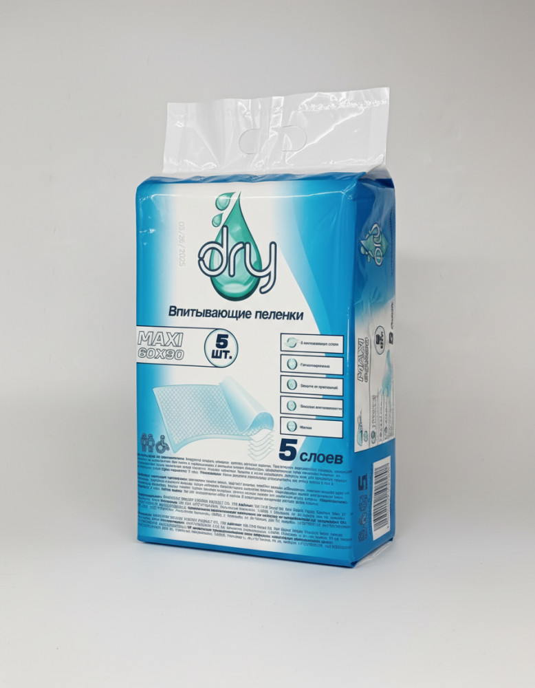 Одноразовые впитывающие пелёнки размером 60×60 см, компактные. Верхний (наружный) слой — мягкий нетканый материал, приятный на ощупь и комфортный для детской кожи. Внутренний слой — впитывающий слой (чаще всего распушённая целлюлоза или аналогичные впитывающие материалы), который быстро поглощает влагу и удерживает её внутри, предотвращая протекание. Нижний слой — водонепроницаемая пленка или аналогичный материал, который надёжно защищает поверхность под пелёнкой (матрац, кровать, пеленальный стол и др.) от жидкости.