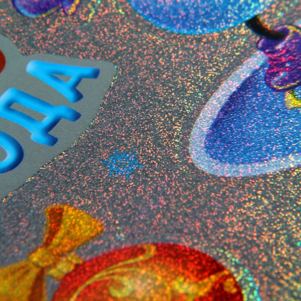 Наклейка яркая, блестит и переливается. Новогоднее настроение обеспечено с таким оформлением.
