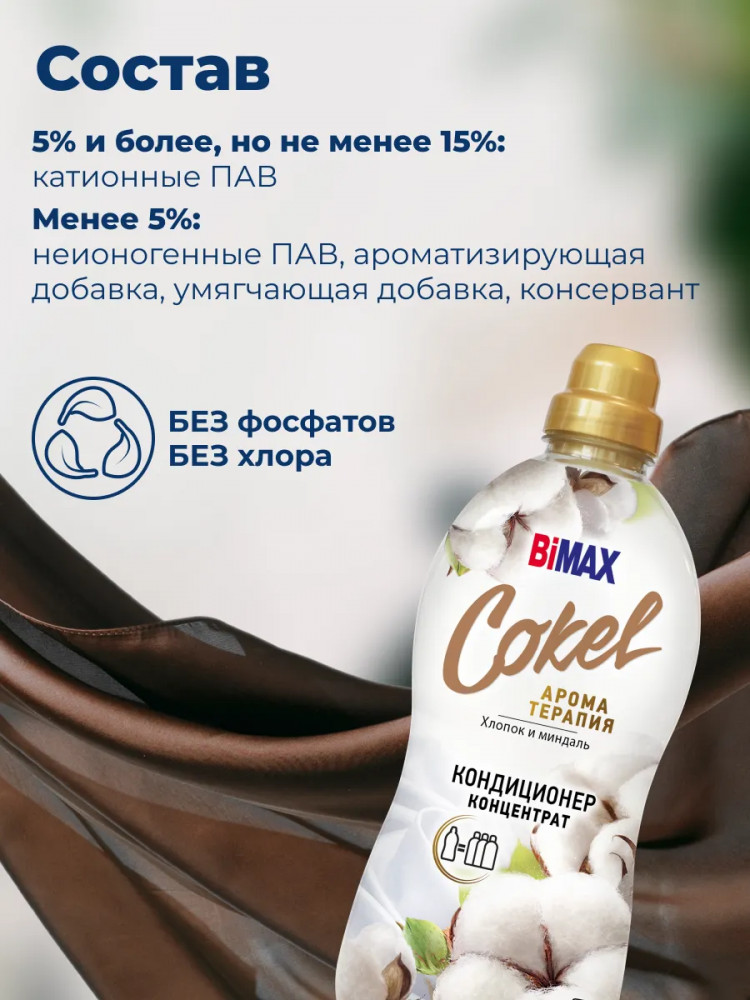 Подарите белью нежность и уютный аромат домашнего уюта. Кондиционер Cokel Bimax «Хлопок и миндаль» — это самое нежное средство в линейке, созданное для деликатного ухода. Специальная гипоаллергенная формула с подтверждённым нулевым аллергеном бережно заботится о тканях, делая их мягкими и приятными на ощупь, а также обеспечивает защиту от статического электричества. После применения ваши вещи наполняются стойким, тёплым и ненавязчивым ароматом, в котором соединяются чистота свежего хлопка и уютное звучание сладкого миндаля. Этот парфюмированный концентрат не просто ополаскивает, а дарит белью ощущение комфорта и заботы, наполняя пространство атмосферой спокойствия.