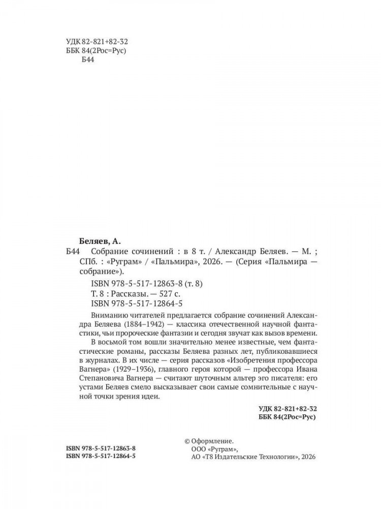 💳 Оплатить за товар можно при получении 🇰🇿 Есть бесплатная доставка по Казахстану от 1 дня 🎁 Копите бонусы с каждой покупки Серия: Пальмира — собрание Вниманию читателей предлагается собрание сочинений Александра Беляева (1884–1942) — классика отечественной научной фантастики, чьи пророческие фантазии и сегодня звучат как вызов времени. В восьмой том вошли значительно менее известные, чем фантастические романы, рассказы Беляева разных лет, публиковавшиеся в журналах. В их числе — серия рассказов «Изобретения профессора Вагнера» (1929–1936), главного героя которой — профессора Ивана Степановича Вагнера — считают шуточным альтер эго писателя: его устами Беляев смело высказывает свои самые сомнительные с научной точки зрения идеи. |