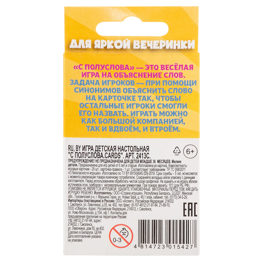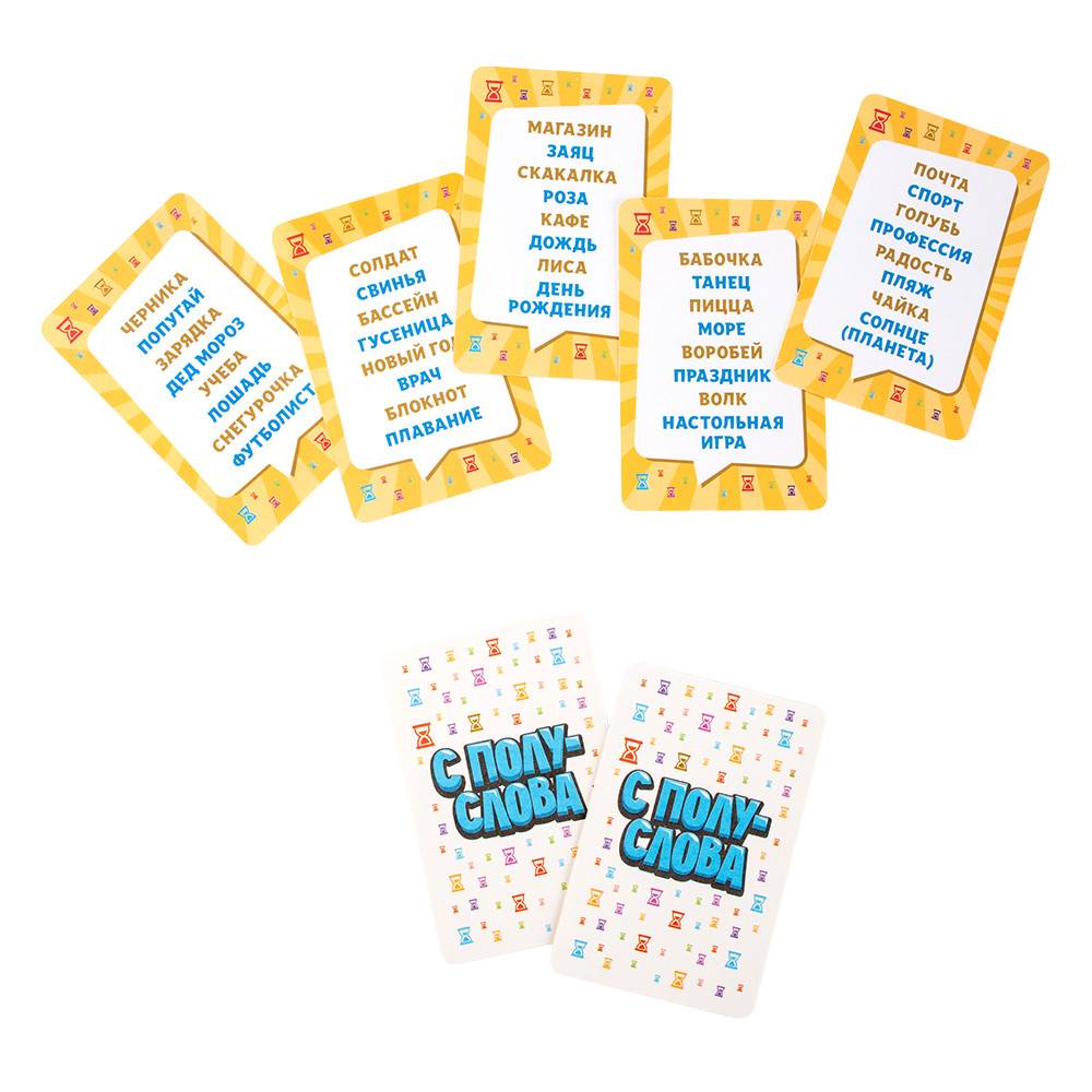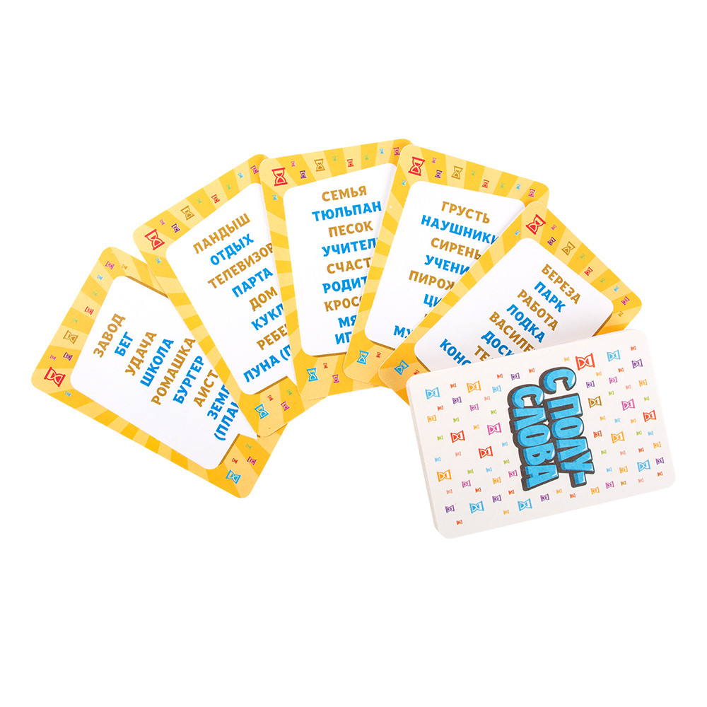 «С полуслова» — динамичная и увлекательная игра на объяснение слов без использования однокоренных слов и жестов. Игрокам предстоит подбирать синонимы, ассоциации и нестандартные подсказки, чтобы команда смогла угадать слово на карточке. Игра отлично развивает словарный запас, креативное мышление, скорость реакции и умение работать в команде. Подходит как для дружеских встреч, так и для семейных вечеров.