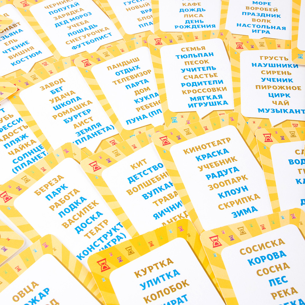 Ход игры: игроки делятся на команды от двух человек, карточки со словами формируются в колоду и кладутся рубашкой вверх, объясняющий игрок берёт карточку и описывает слово, не называя его и однокоренные слова, команда старается угадать слово, за каждое угаданное начисляется одно очко, на объяснение даётся одна минута, побеждает команда, набравшая наибольшее количество очков.