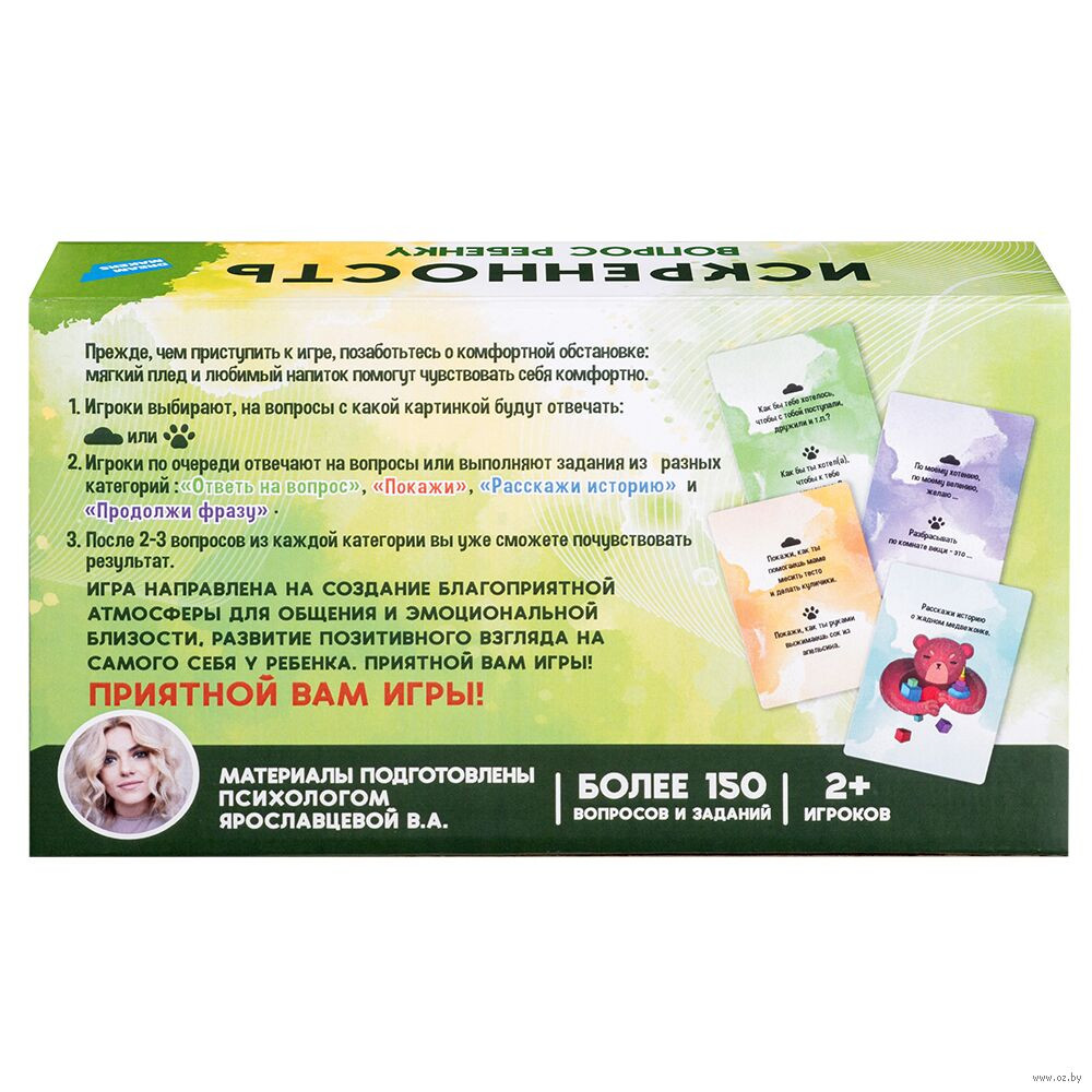Это увлекательная семейная игра, созданная для тёплого общения, эмоциональной близости и лучшего понимания ребёнка. Игра разработана психологом Ярославцевой В.А. и направлена на формирование доверительной атмосферы в семье, развитие самопознания и позитивного самовосприятия у детей. Более 150 вопросов и заданий помогают раскрыть эмоции, мечты и сильные стороны ребёнка, а также делают совместное времяпрепровождение по-настоящему ценным и интересным. Игра подходит для детей от 6 лет и взрослых и станет отличным инструментом для укрепления семейных связей.