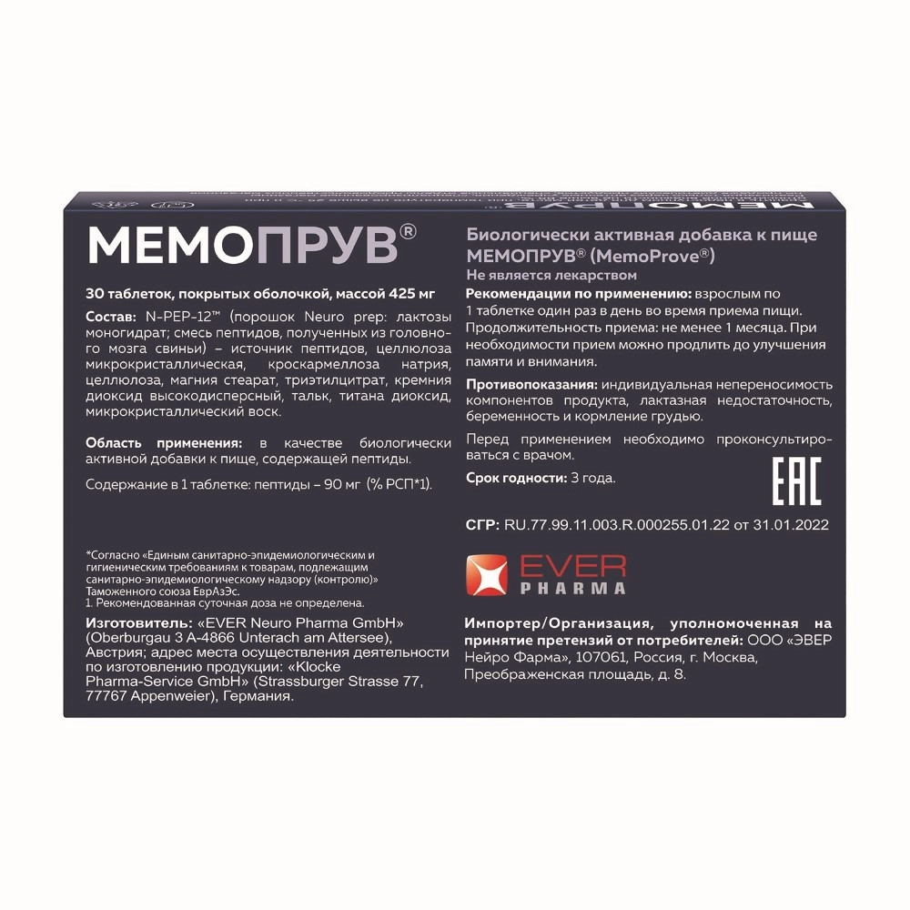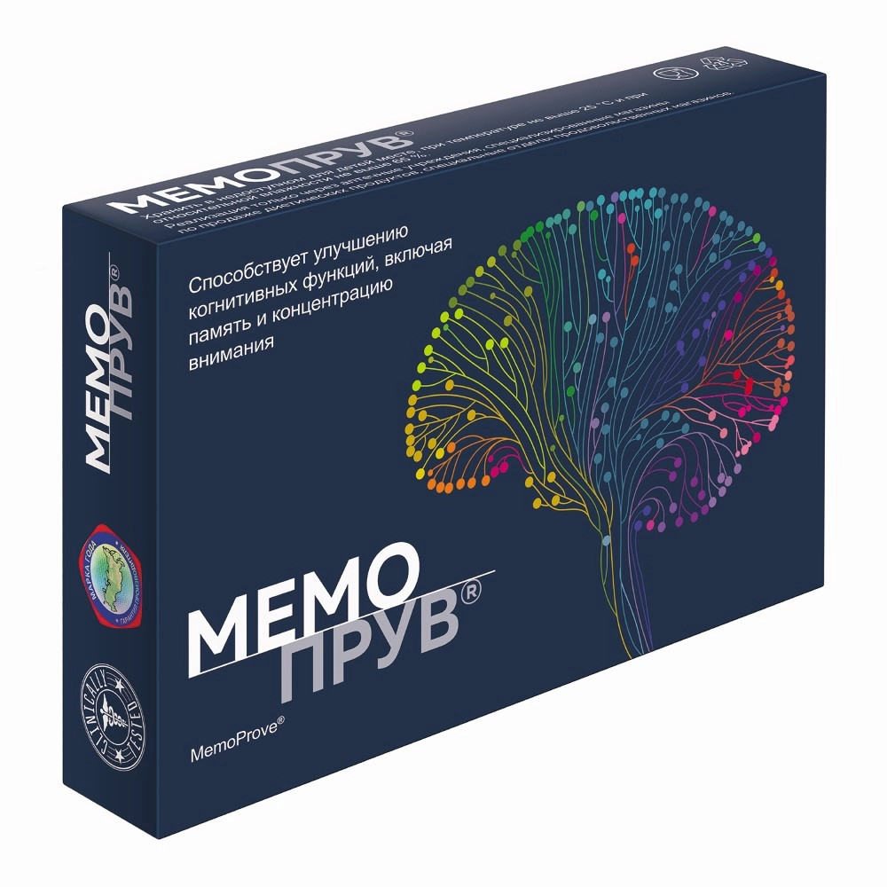 MemoProve — биологически активная добавка (БАД) к пище с доказанной клинической эффективностью при возникновении легких и умеренных проблем с памятью. В состав Мемопрув® входит запатентованная смесь пептидов N-PEP-12™, способствующая поддержанию оптимального уровня когнитивных функций. Содержание в 1 таблетке: пептиды 90 мг. Клинически доказано, что Мемопрув® способствует улучшению памяти уже к 30 дню применения. Исследования показывают, что кратковременная память ухудшается с возрастом. Ухудшения могут начинаться с 25 лет и продолжаться на протяжении всей жизни.