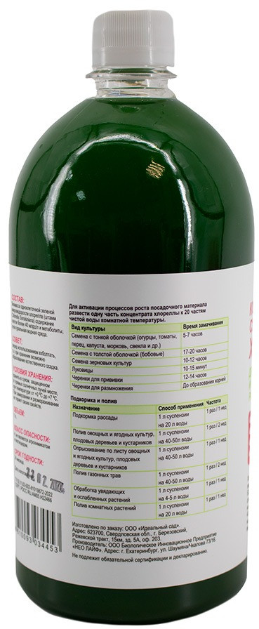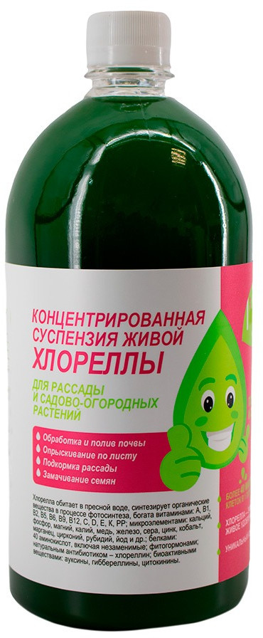 Применение: для активации процессов роста посадочного материала развести 1 часть концентрата хлореллы с 20 частями чистой воды комнатной температуры.