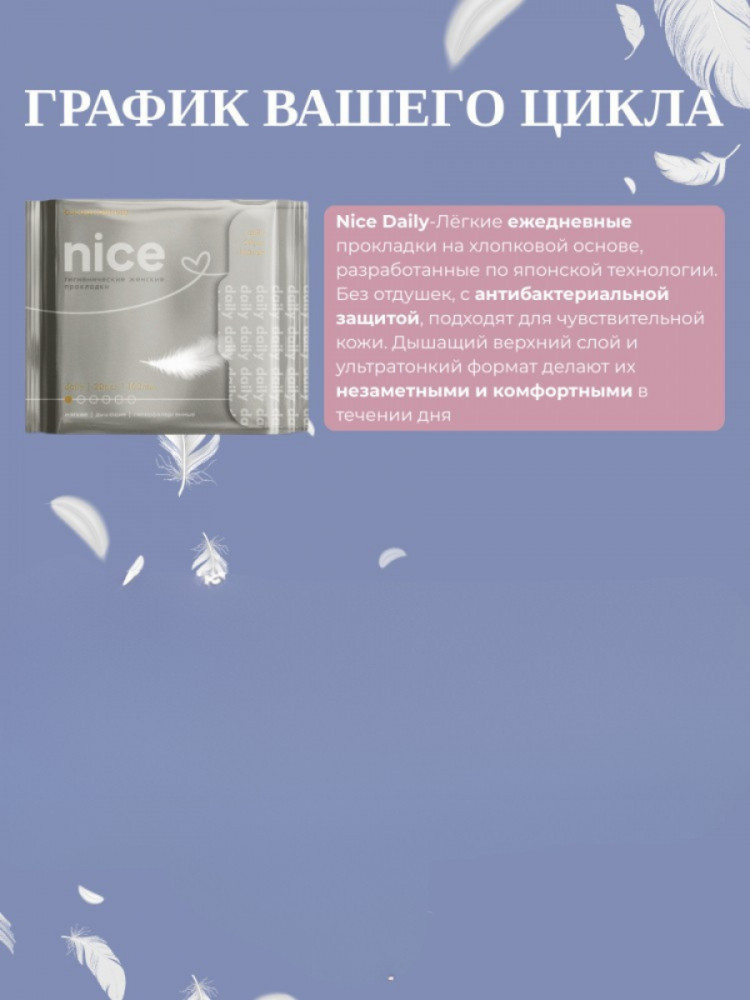 NICE — бренд женских гигиенических прокладок, разработанных по японской технологии. Прокладки обеспечивают комфорт, надёжную защиту и подходят для ежедневного использования. |
