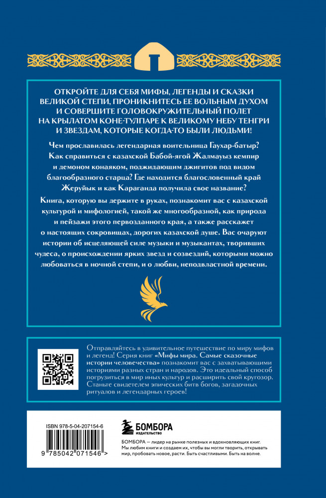 Как приручить крылатого коня-тулпара — верного спутника батыра? Что общего у легенды о поэте Асане Кайгы и его возлюбленной пери-лебеди и скандинавскими сагами? И как выглядит демон Эрклик — хозяин преисподней и вечный враг Тенгри? На эти и другие вопросы вы найдете ответы на страницах этой книги, а цветные и черно-белые иллюстрации дополнят путешествие по казахской степи, где каждая река, гора и ущелье готовы поделиться с путником печальной, поучительной или забавной историей. Серия книг «Мифы мира. Самые сказочные истории человечества» познакомит вас с захватывающими историями разных стран и народов. Это идеальный способ погрузиться в мир иных культур и расширить свой кругозор. Станьте свидетелем эпических битв богов, загадочных ритуалов и легендарных героев! |