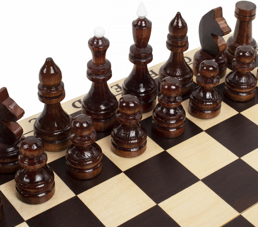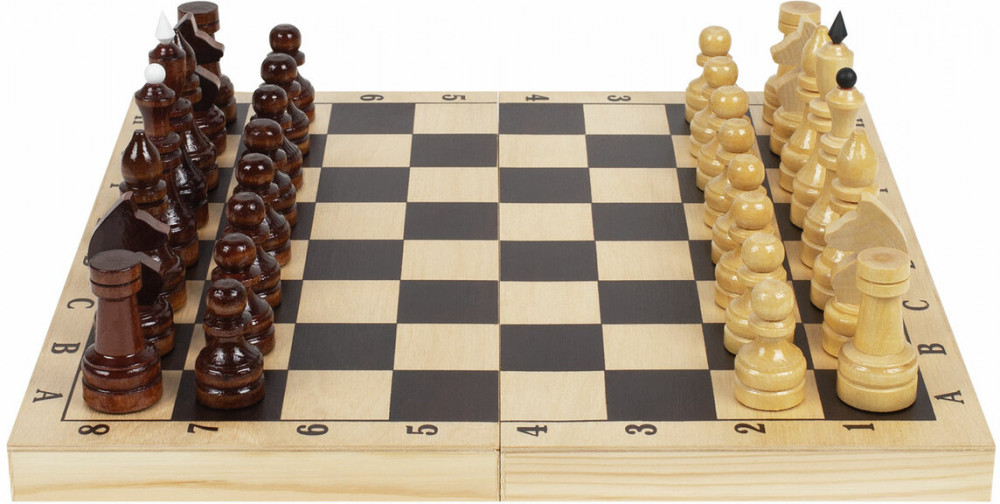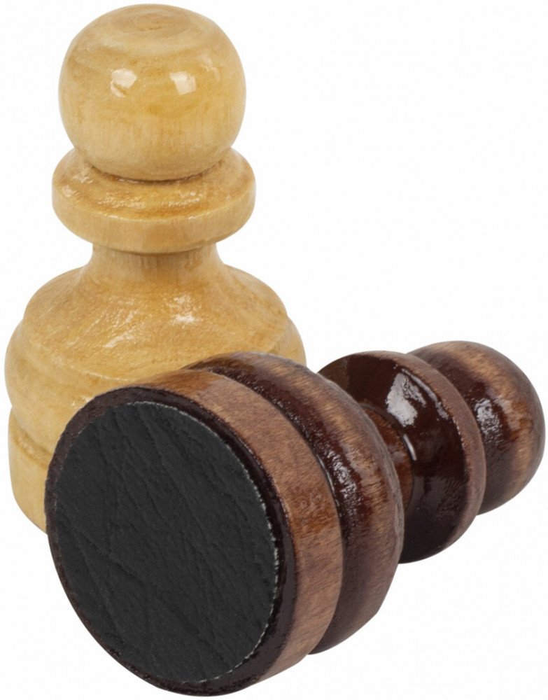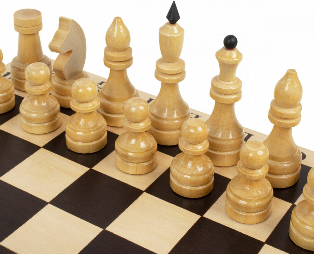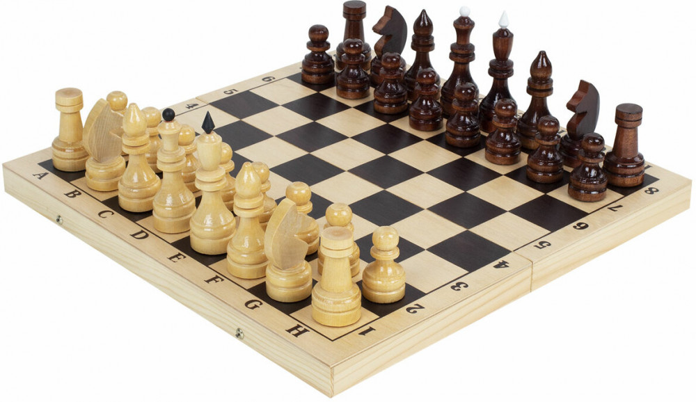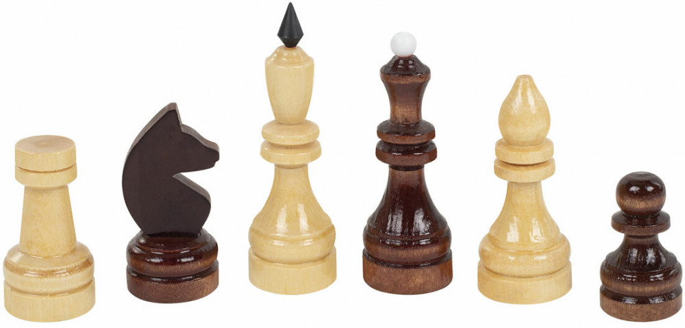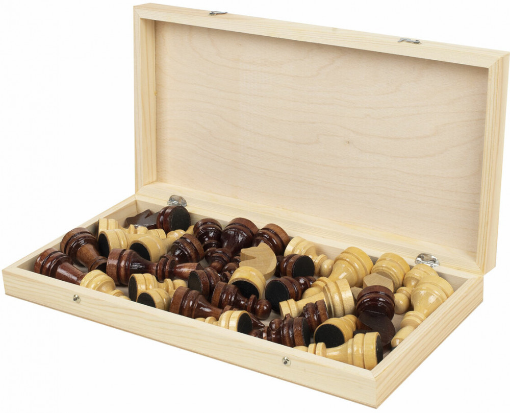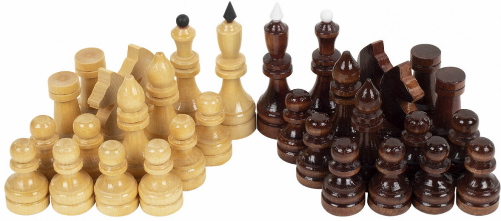 • шахматные фигуры из хвойных и лиственных пород дерева (32 штуки): 16 светлых и 16 темных, с защитным лаковым покрытием.