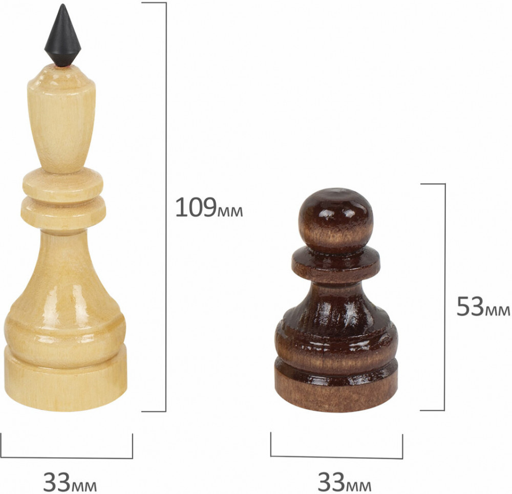 • высота от 4,4 см (пешки) до 10,5 см (король).