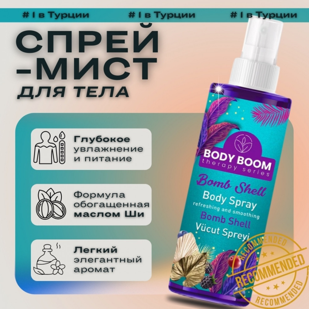 Продукт удобно брать с собой: компактный флакон объемом 100 мл легко помещается в сумочку и не занимает много места. Надёжный распылитель позволяет экономно использовать средство и равномерно распределять его по коже. Благодаря современному дизайну флакон выглядит стильно и современно — его не стыдно показать или подарить. Спрей также можно использовать как лёгкий парфюм, если вы предпочитаете нежные и ненавязчивые ароматы. Он идеально подходит для тёплого времени года, когда кожа особенно нуждается в увлажнении и защите. BODY BOOM Bomb Shell Body Spray — это не просто аромат, это полноценный элемент ежедневного ухода, способный подарить как приятные тактильные ощущения, так и эстетическое удовольствие от применения.
