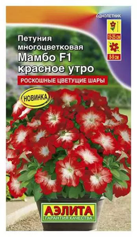 Аэлита Семена петунии «Мамбо F1 Красное утро»В данный момент этот товар отсутствует в продаже. Возможно, у нас найдется аналогичный или похожий товар здесь. Ценная серия генетически низкорослых, обильно цветущих гибридов. Высота взрослых растений от 15 см (в горшках) до 25 см (о/г). Применять регуляторы роста не нужно. Компактные кусты цветут парадоксально крупными для карликов цветками Ø 8-9 см и выглядят роскошными цветущими шарами. Декоративность серии не страдает в ненастную погоду. Кустики стабильно сохраняют привлекательный вид, не вытягиваются. Серия пригодна для воплощения любых дизайнерских проектов при оформлении цветников открытого грунта, балконов, патио, уличных контейнеров. |