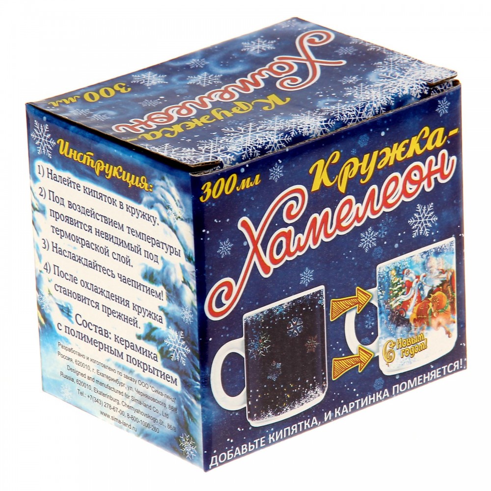 Кружка-хамелеон «Дед Мороз на тройке», 250 млВ данный момент этот товар отсутствует в продаже. Возможно, у нас найдется аналогичный или похожий товар здесь. Поздравьте родных, друзей или коллег с Новым годом так, чтобы память о вашем подарке не угасала, а сувенир радовал своего обладателя на протяжении всего года!На первый взгляд, кружка-хамелеон «Дед Мороз на тройке» - это обычная кухонная утварь, но она таит в себе маленький секрет. Стоит только налить любимый горячий напиток, как кружка моментально начнет менять свой рисунок. |