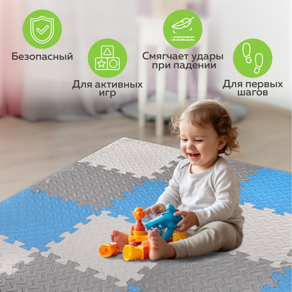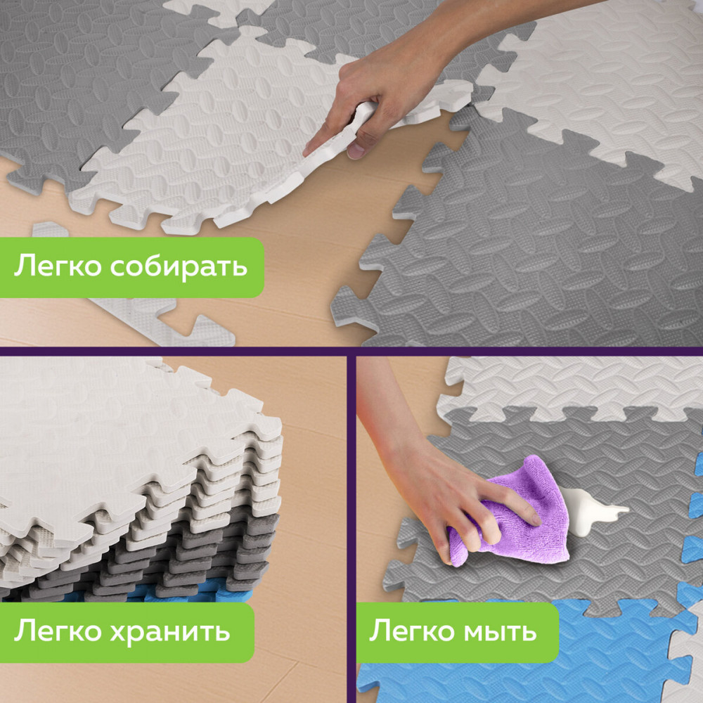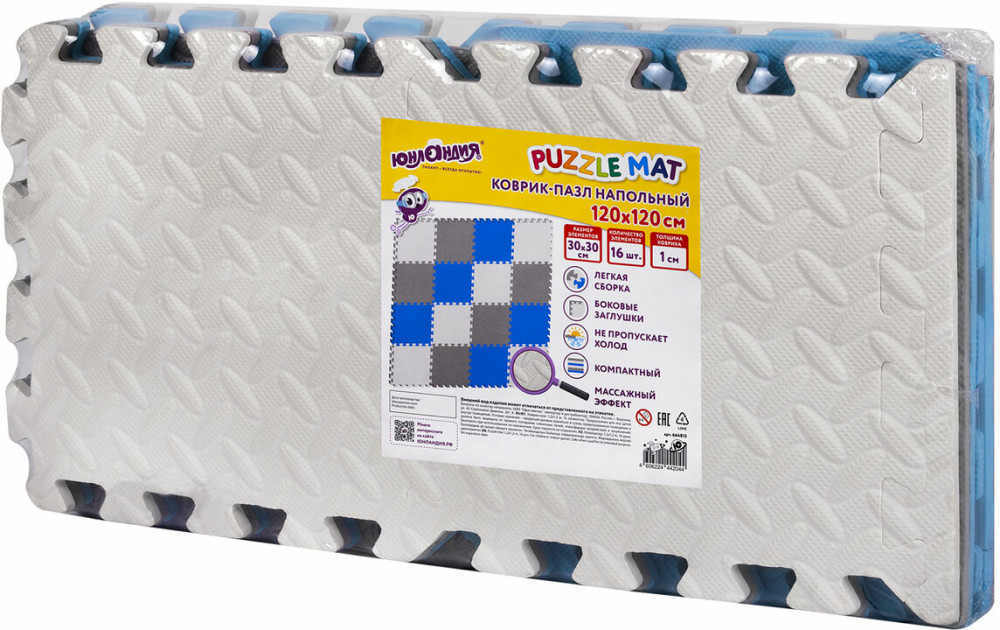 💳 Оплатить за товар можно при получении 🇰🇿 Есть бесплатная доставка по Казахстану от 1 дня 🎁 Копите бонусы с каждой покупки Коврики-пазлы Юнландия — мягкие коврики, обладающие теплоизоляционными и шумоизоляционными свойствами, изготовленные из безопасного материала. Легко собираются и разбираются, удобны и компактны в хранении. Этот мягкий и безопасный развивающий коврик состоит из 16 квадратных элементов с массажным эффектом и размерами 30×30 см каждый. Также в комплекте идут боковые заглушки в количестве 16 штук. Толщина элементов составляет 1 см. Общая площадь — 120×120 см. Коврик включает в себя элементы трёх цветов (серый, голубой, светло-серый) |