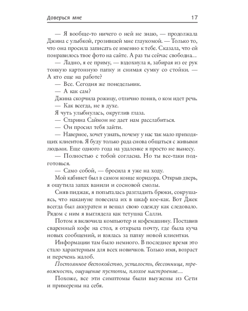 💳 Оплатить за товар можно при получении 🇰🇿 Есть бесплатная доставка по Казахстану от 1 дня 🎁 Копите бонусы с каждой покупки Серия: Психологический триллер На прием к психотерапевту Саре приходит молодая клиентка по имени Элла, которая рассказывает о совершенном ею убийстве. Но чем дальше, тем яснее становится, что эта история слишком похожа на преступление, совершенное самой Сарой много лет назад. Сара понимает, что Элла пришла к ней неспроста, и пытается выяснить причину. Но внезапно начинается череда странных событий, и Сара опасается уже за собственную жизнь… |