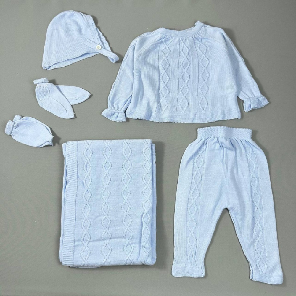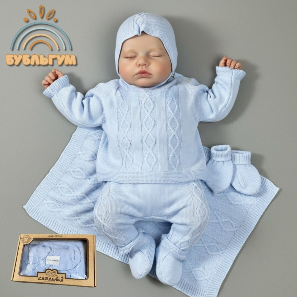 Вязаный комплект для новорождённого выполнен из мягкого и тёплого материала, приятного к нежной коже малыша. В набор входят кофточка, штанишки, шапочка, пинетки и плед — всё необходимое для комфорта и уюта с первых дней жизни. Аккуратная вязка, эластичные манжеты и удобный крой обеспечивают тепло и свободу движений.