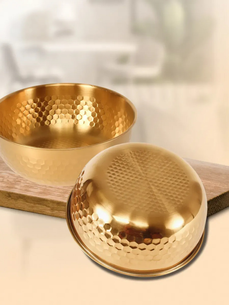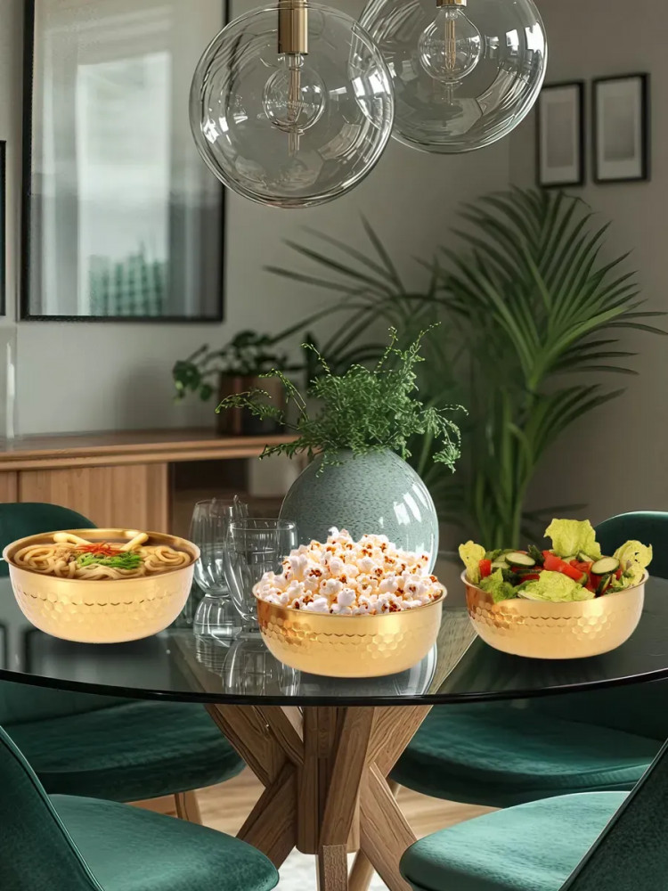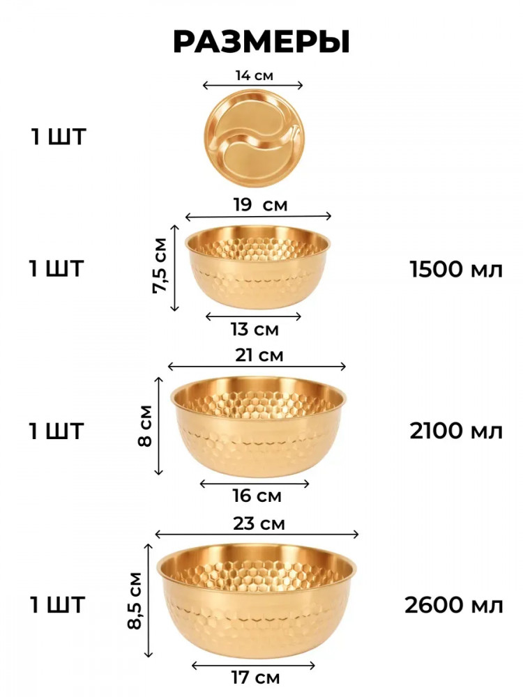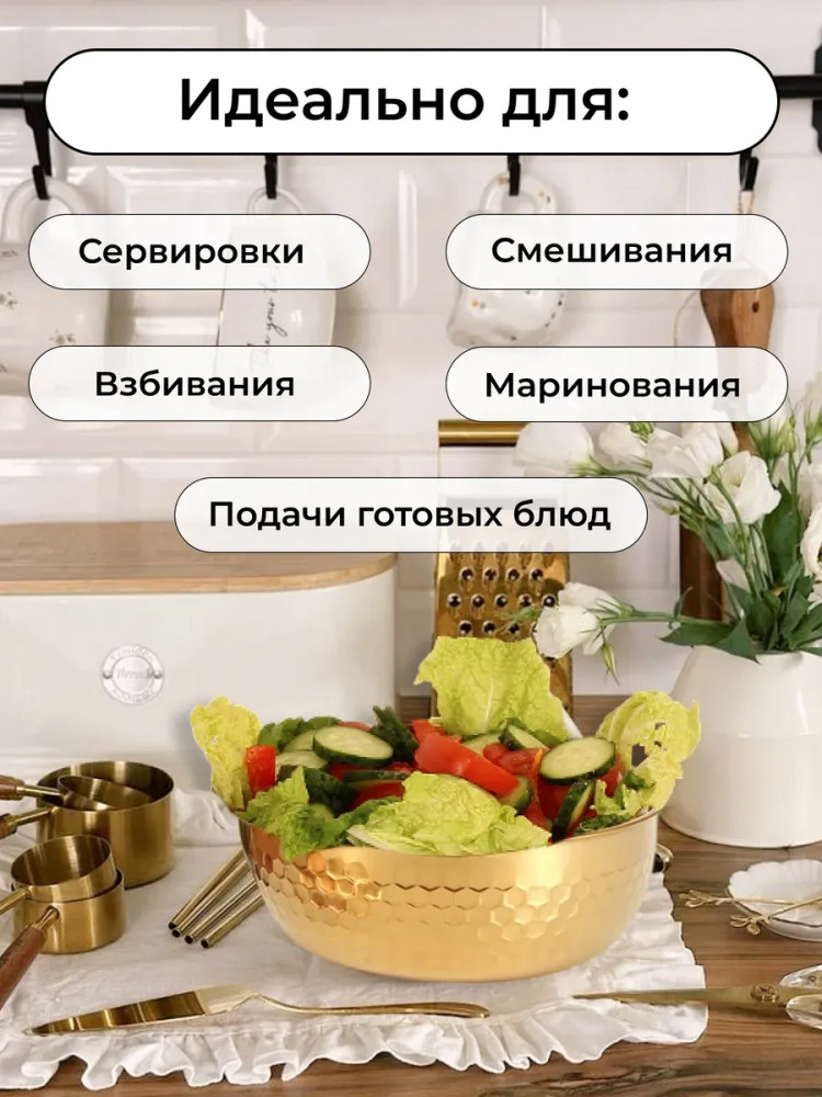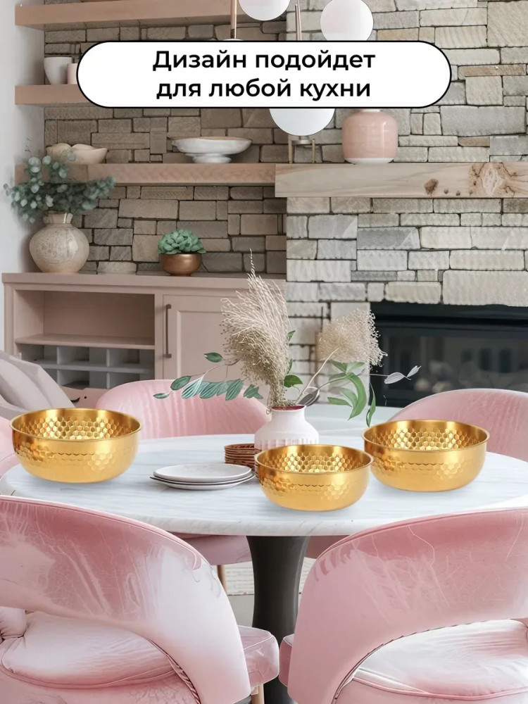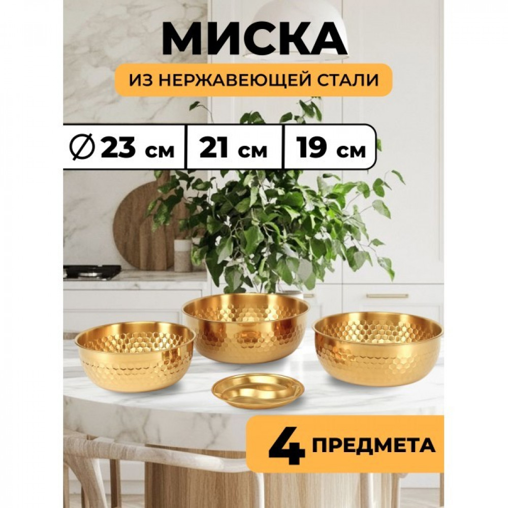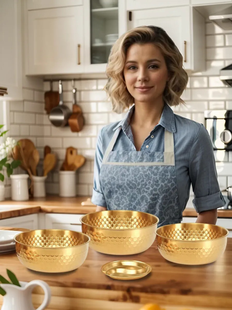 Высококачественный набор из прочной нержавеющей стали — идеальное решение для любой современной кухни. Представленные в элегантном золотом цвете, эти глубокие миски и менажница станут незаменимыми помощниками при приготовлении свежих и вкусных салатов. Изготовленные из устойчивой к коррозии нержавеющей стали, миски отличаются долговечностью и надежностью. Их прочная конструкция обеспечивает сохранность полезных свойств и ароматов и ингредиентов. Благодаря универсальному дизайну, набор гармонично впишется в любой кухонный интерьер, придавая ему завершенный и элегантный вид.
