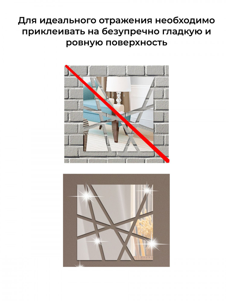 Гибкое акриловое панно создаст объемный и интересный эффект на любой гладкой поверхности. Оно надежно держится на натяжных потолках в спальне или обоях в гостиной. Вы сможете преобразить все предметы мебели, от шкафа до комода, а также любые поверхности, например, стену или даже холодильник. Декоративное настенное зеркало на входную дверь — это практичный и украшающий элемент для любого интерьера. Выбирайте нашу коллекцию зеркальных наклеек как украшение на стену или интерьерное панно, чтобы создать уникальный интерьер, отражающий вашу индивидуальность и разные аспекты вашего жизненного пространства.