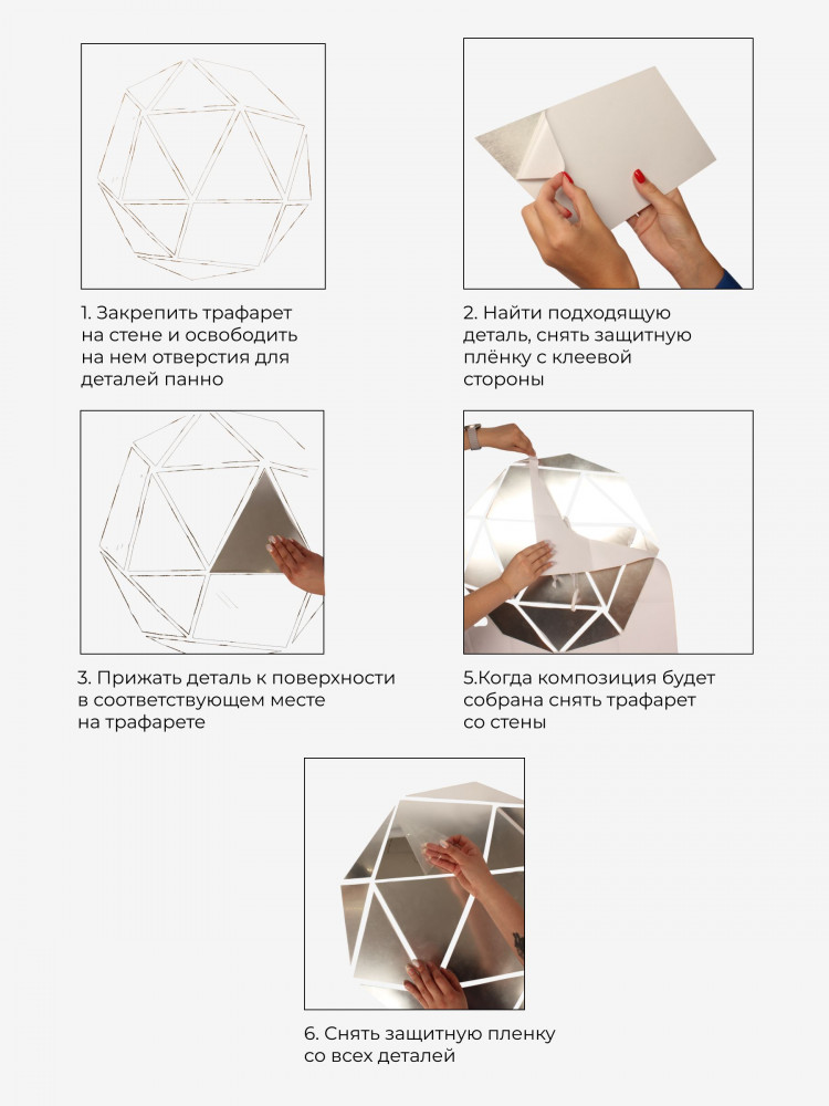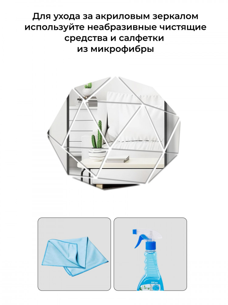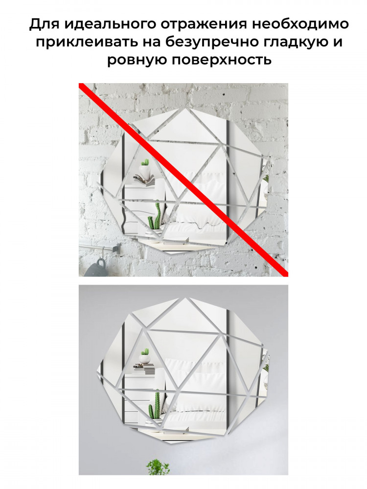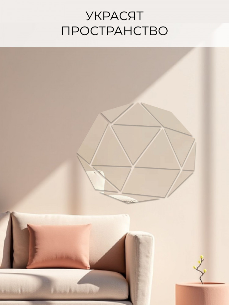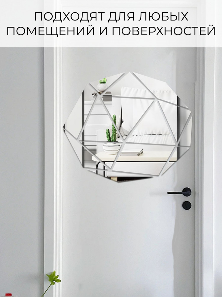 Гибкое акриловое панно создаст объемный и интересный эффект на любой гладкой поверхности. Оно надежно держится на натяжных потолках в спальне или обоях в гостиной. Вы сможете преобразить все предметы мебели, от шкафа до комода, а также любые поверхности, например, стену или даже холодильник. Декоративное настенное зеркало на входную дверь — это практичный и украшающий элемент для любого интерьера. Выбирайте нашу коллекцию зеркальных наклеек как украшение на стену или интерьерное панно, чтобы создать уникальный интерьер, отражающий вашу индивидуальность и разные аспекты вашего жизненного пространства.