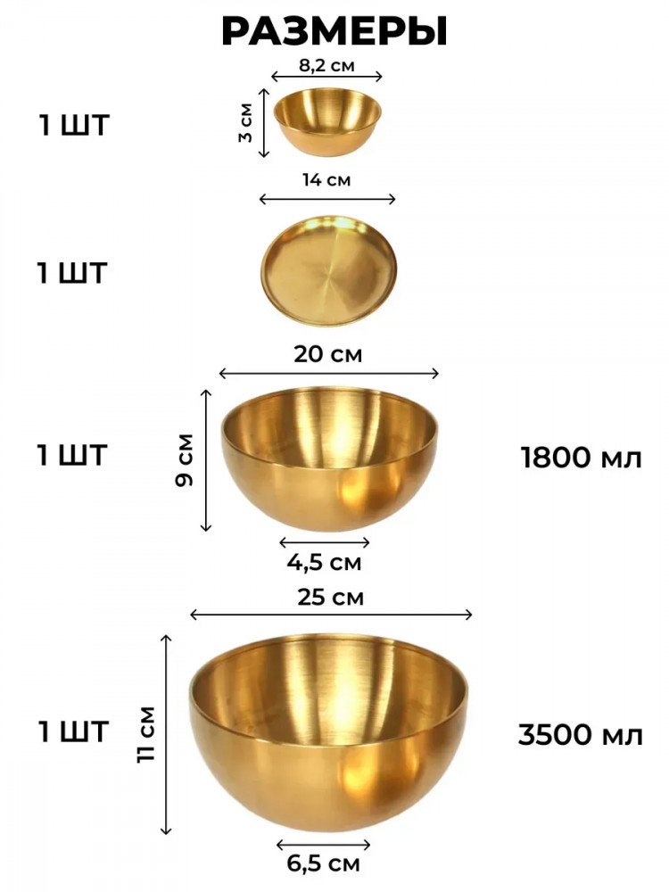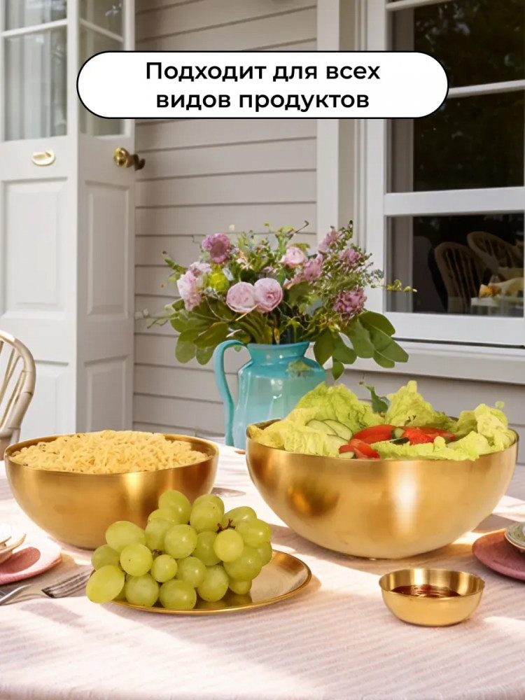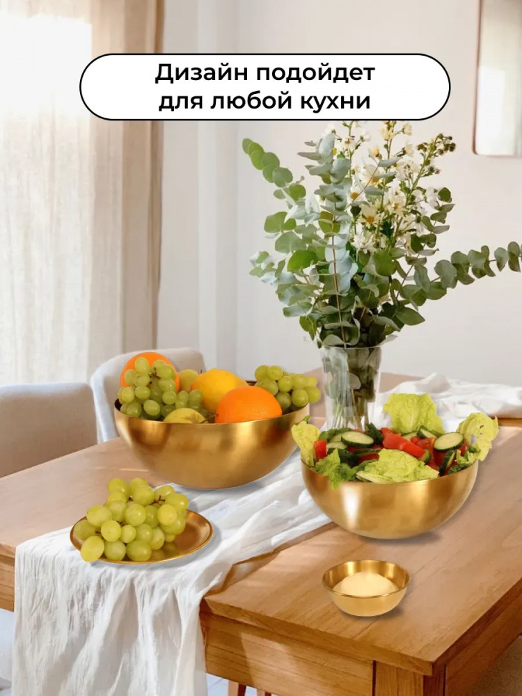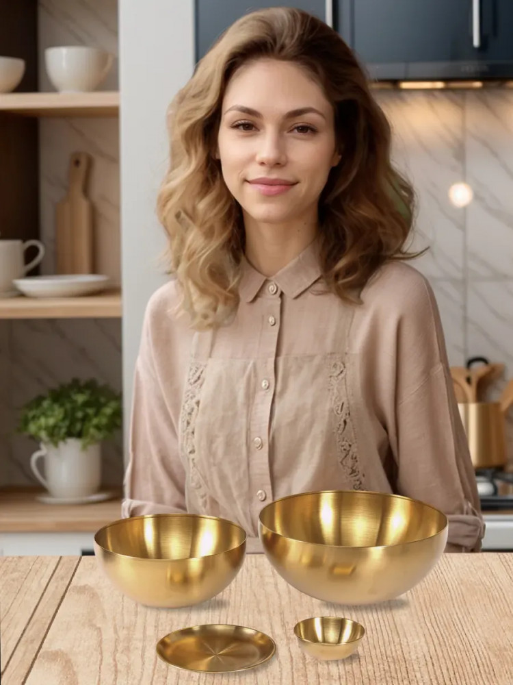 Высококачественный набор из прочной нержавеющей стали — идеальное решение для любой современной кухни. Представленные в элегантном золотом цвете, эти глубокие миски, блюдце и соусник станут незаменимыми помощниками при приготовлении свежих и вкусных салатов. Изготовленные из устойчивой к коррозии нержавеющей стали, миски отличаются долговечностью и надежностью. Их прочная конструкция обеспечивает сохранность полезных свойств и ароматов и ингредиентов. Благодаря универсальному дизайну, набор гармонично впишется в любой кухонный интерьер, придавая ему завершенный и элегантный вид.