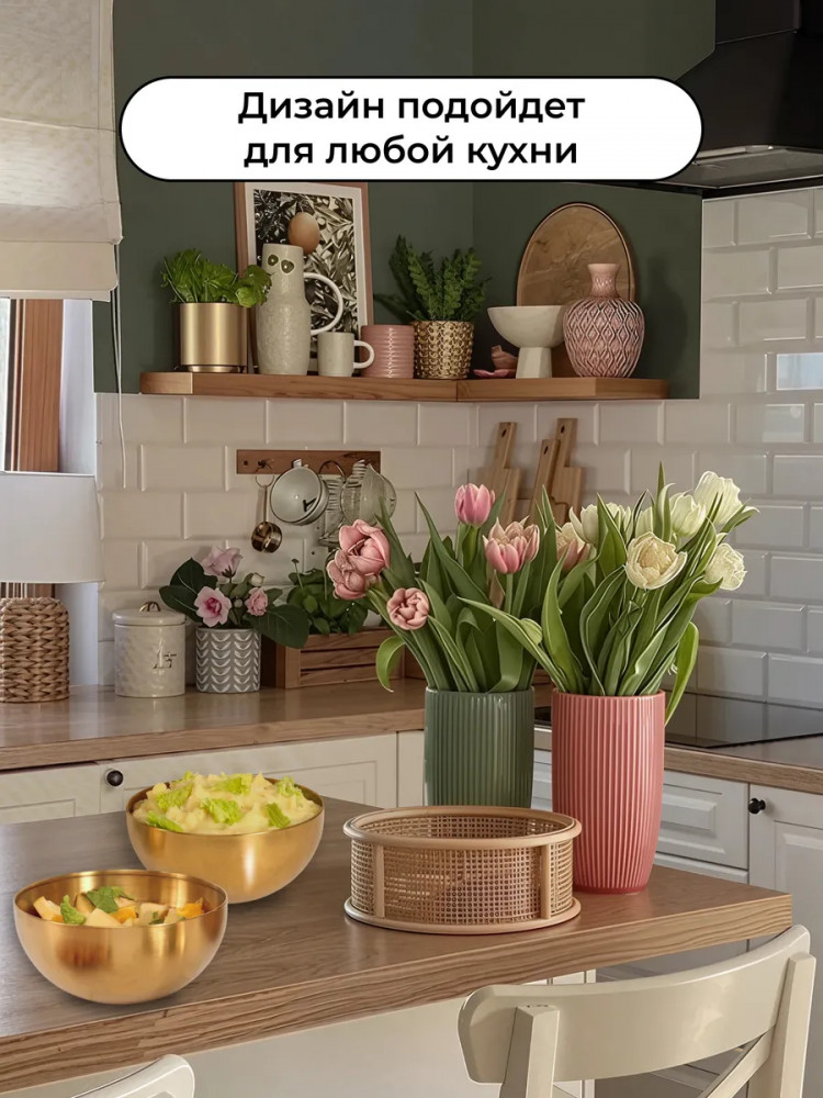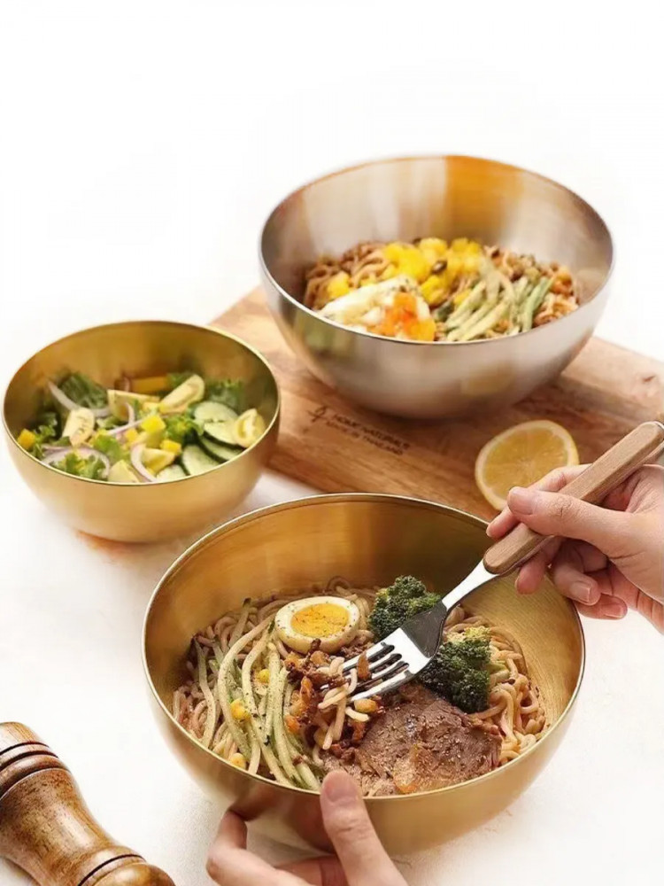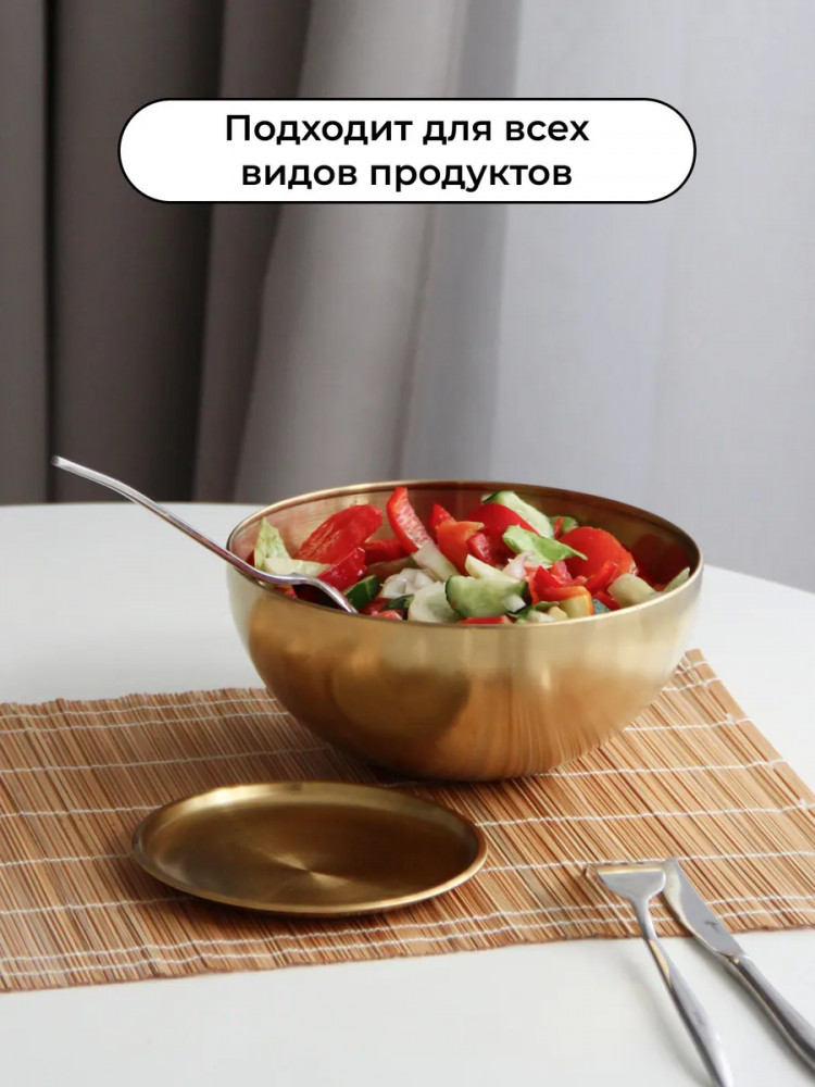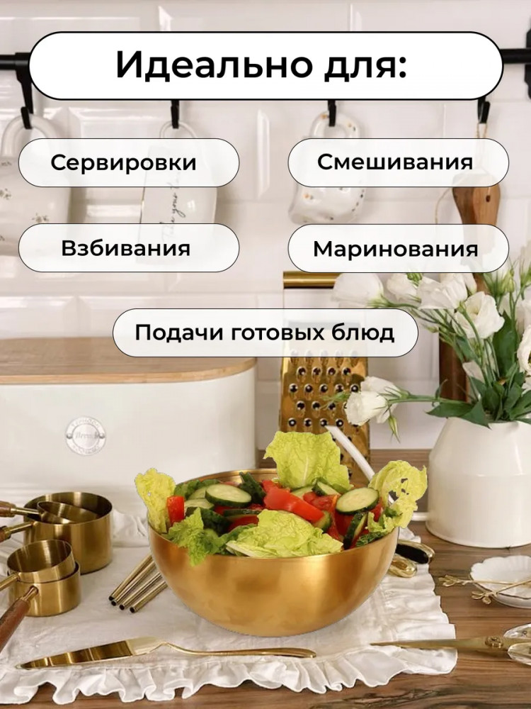 Высококачественный набор из прочной нержавеющей стали — идеальное решение для любой современной кухни. Представленные в элегантном золотом цвете, эти глубокие миски и блюдца станут незаменимыми помощниками при приготовлении свежих и вкусных салатов. Изготовленные из устойчивой к коррозии нержавеющей стали, миски отличаются долговечностью и надежностью. Их прочная конструкция обеспечивает сохранность полезных свойств и ароматов и ингредиентов. Благодаря универсальному дизайну, набор гармонично впишется в любой кухонный интерьер, придавая ему завершенный и элегантный вид.