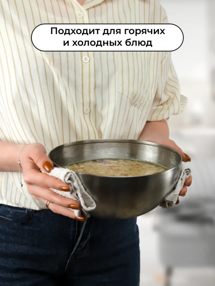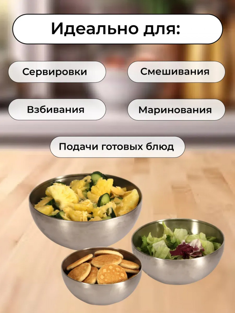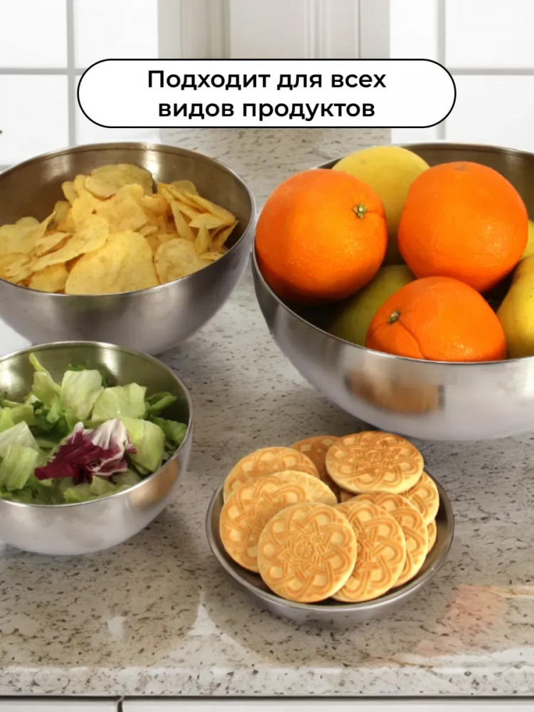 Высококачественный набор из прочной нержавеющей стали — идеальное решение для любой современной кухни. Представленные в элегантном серебряном цвете, эти глубокие миски и блюдца станут незаменимыми помощниками при приготовлении свежих и вкусных салатов. Изготовленные из устойчивой к коррозии нержавеющей стали, миски отличаются долговечностью и надежностью. Их прочная конструкция обеспечивает сохранность полезных свойств и ароматов и ингредиентов. Благодаря универсальному дизайну, набор гармонично впишется в любой кухонный интерьер, придавая ему завершенный и элегантный вид.